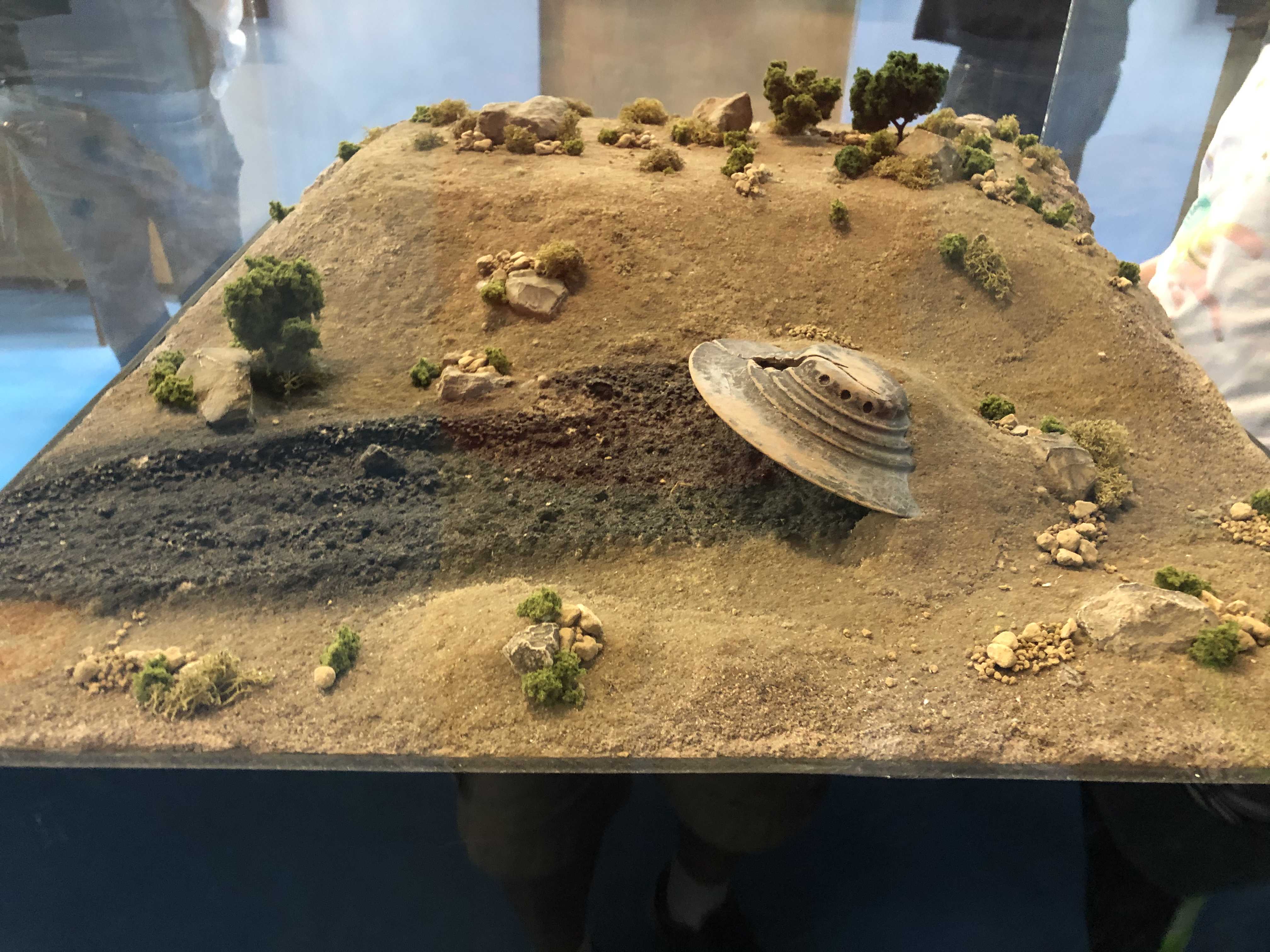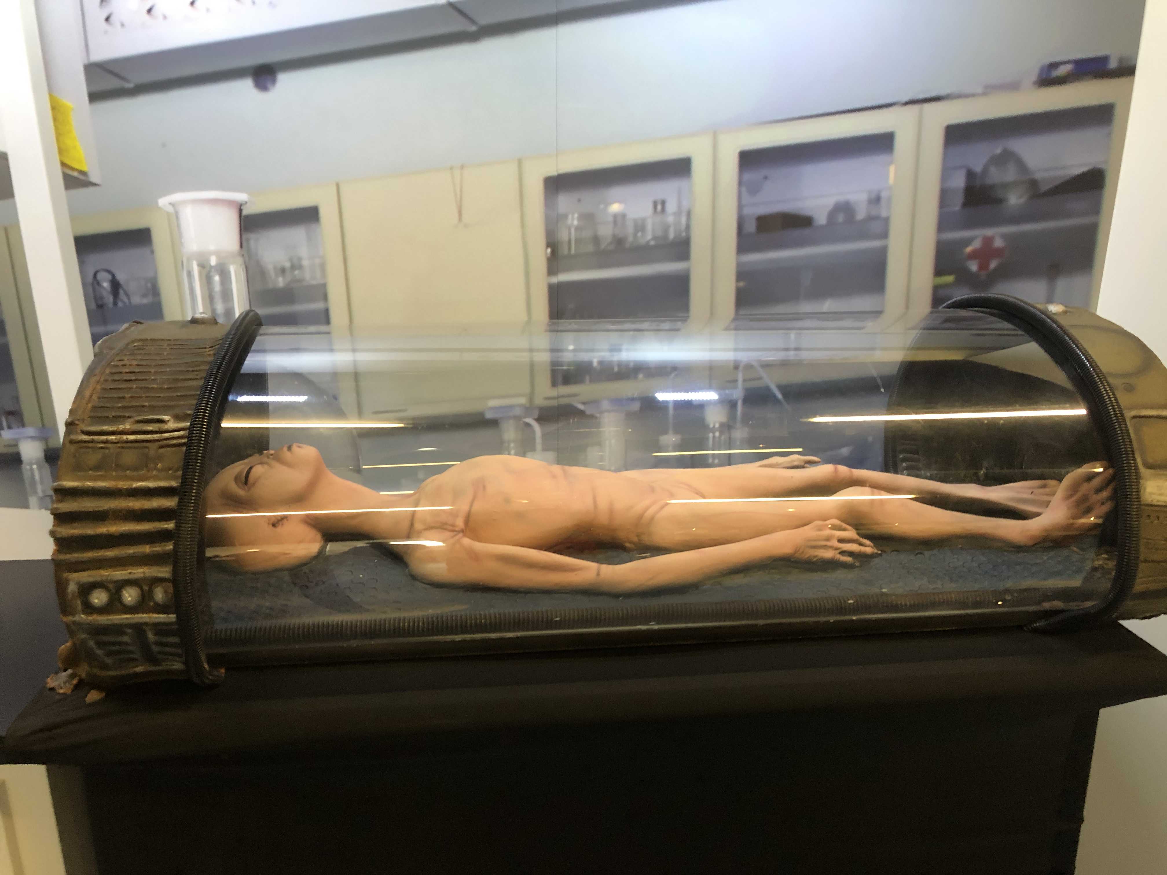 로스웰 사건과 관련하여 미군당국이 잔해수거시 외계인 사체 및 부상자를 발견하여 비밀기지에 숨겨두었다는 주장도 나오기 시작했다. 1947년 7월 3일 미국의 한 토목기사가 측량작업중 UFO의 파편을 발견하였고 파편 근처에 죽은 생명체 발견했다는 이야기가 전해진다. 외계인 생명체는 열살 정도의 초등학생 크기였고 미끈한 몸과 머리가 꽤 큰 모습으로 모두 회색옷을 입고 있었다고 한다. 박물관에서는 그 사체를 보관하는 캡슐을 형상화하여 전시해놓았다.