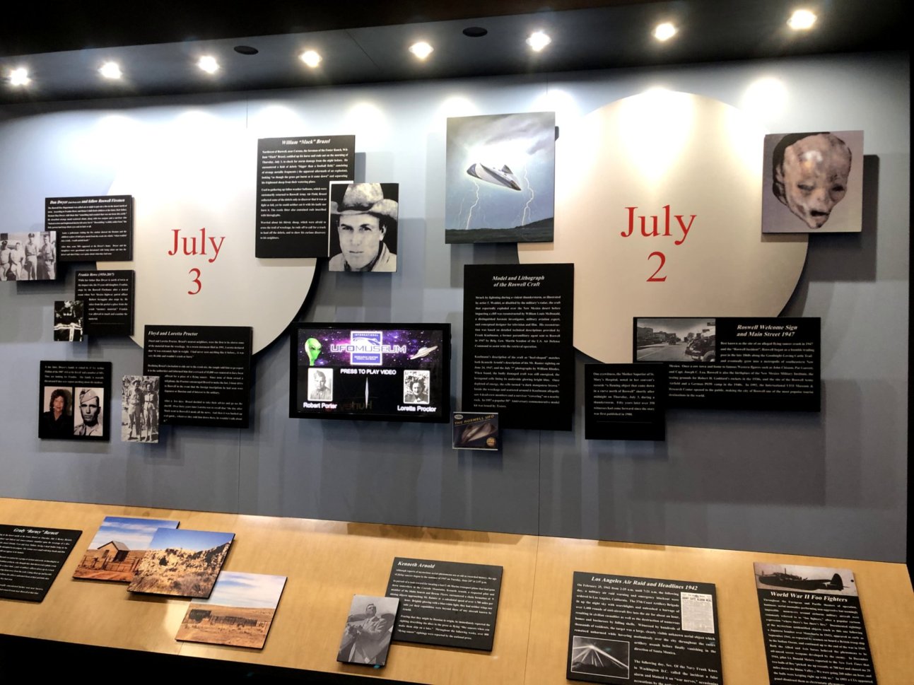 박물관 입장 후 처음 맞닥뜨리는 것은 1947년 추락한 UFO 잔해에 탑승했을 것으로 추정되는 외계인의 모형이다. 가족들과 간단히 기념 사진을 찍은 후 안으로 들어가면 1947년 로스웰 사건을 일자별로, 그리고 인물의 증언별로 기술해 놓은 안내판들이 당시 찍은 사진 및 인공 모형들과 함께 진열되어있다.