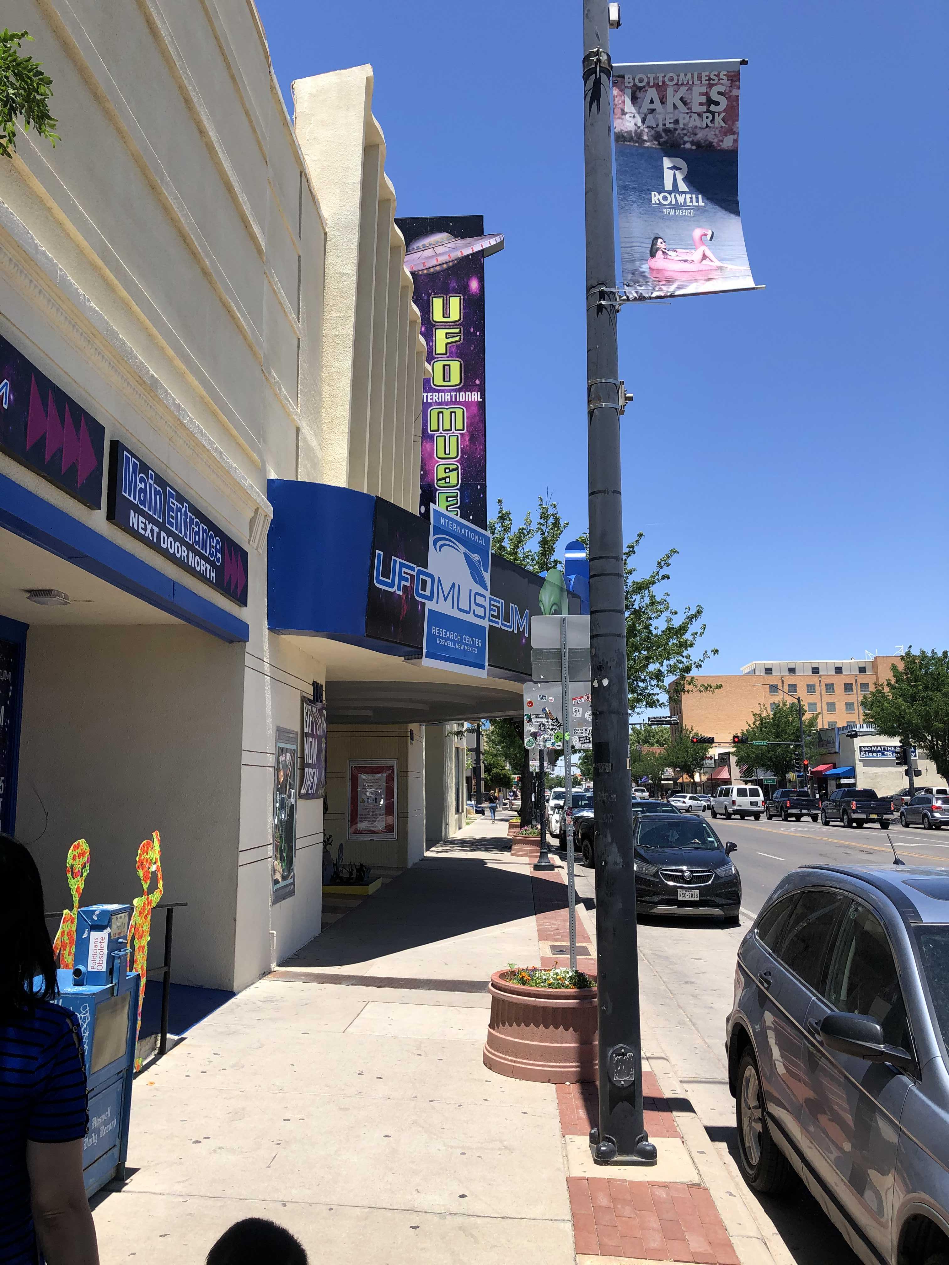 로스웰 다운 타운에 위치한 로스웰 UFO 박물관은 로스웰 사건을 바탕으로 한 UFO 목격담 및 음모론에 관련된 이야기들을 소개해놓은 곳이다. 한적한 도시 한 가운데 많은 차가 주차되어 방문자의 수가 적지 않다는 것을 말해준다.