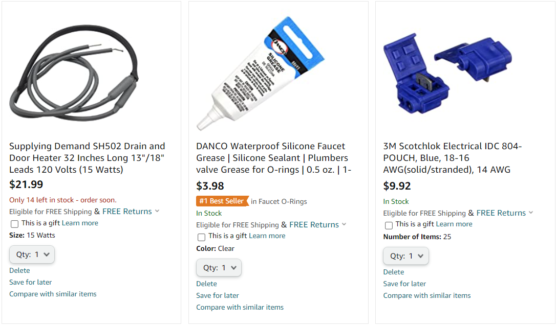 일단 저온히터선을 구입해 쿨링팬 주위에 있는 프레온 가스관 주변에 설치하기로 했다. 아마존에서 약 40달러의 비용을 지불하고 저온히터선과 연결에 필요한 실리콘과 커넥터를 주문했다.