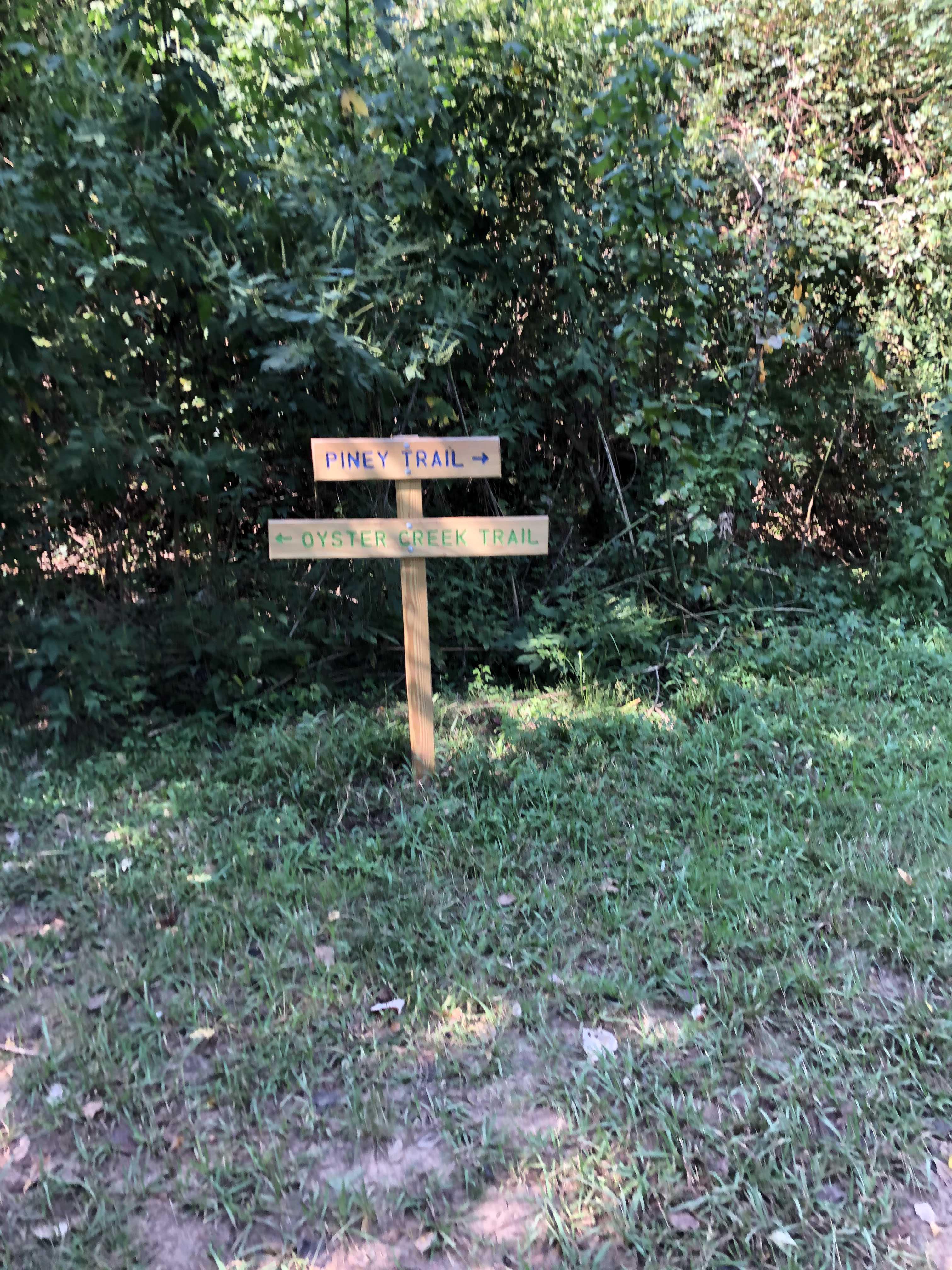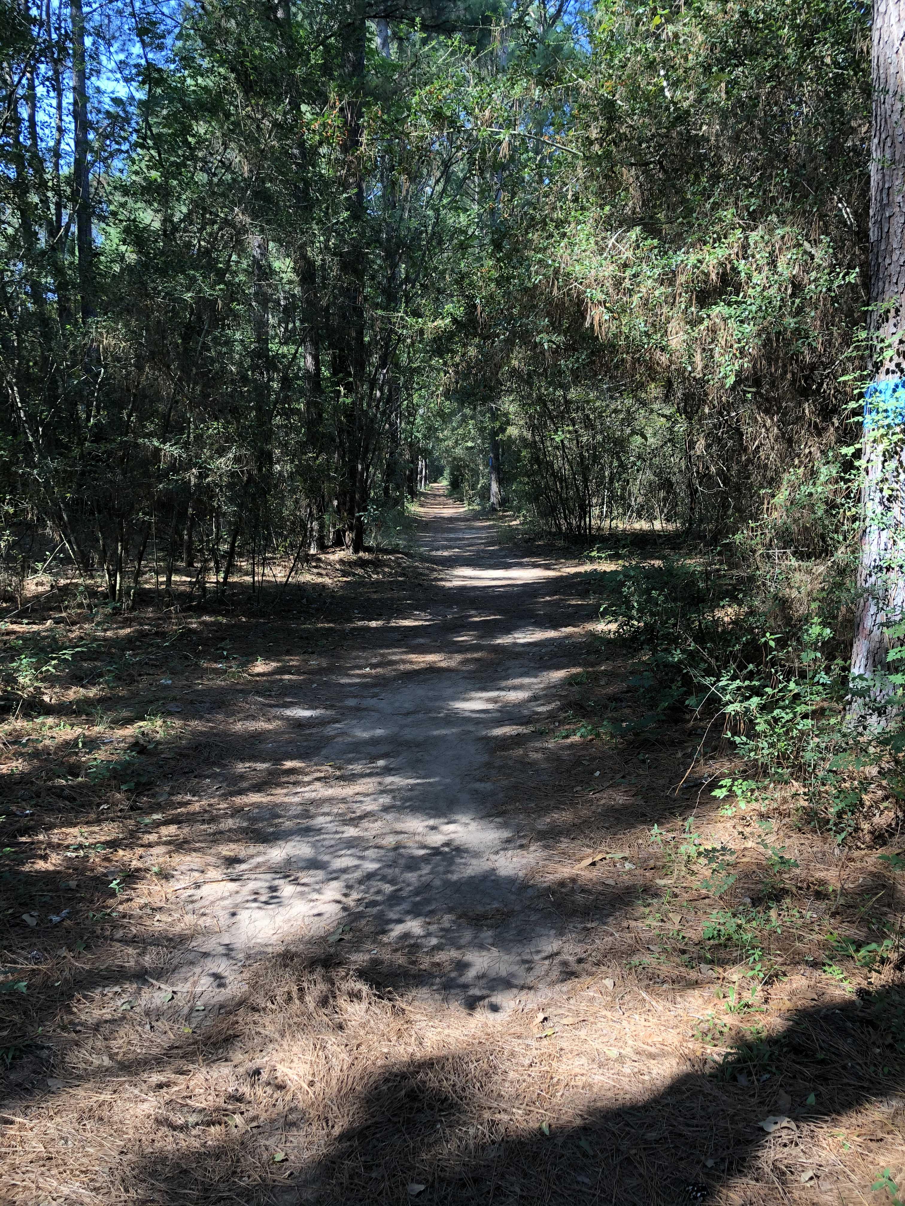 그렇게 회상에 젖어 걷다 보니 Oyster Creek Trail과 Piney Trail이 나누어지는 갈림길에 들어섰다. 워낙 울창한 숲속에서 여러 가지 갈래길들이 있는지라 방문객들이 헷갈리지 않도록 오솔 길가에 있는 나무에 페인트로 색깔 표시를 해놓았다. 예를 들면 Pine Trail를 따라서 가면 길가에 있는 나무에 파란 페인트가 칠해져 있어 내가 지도에 나와있는 오솔길을 잘 따라서 가고 있는지 확인할 수 있도록 해주었다.