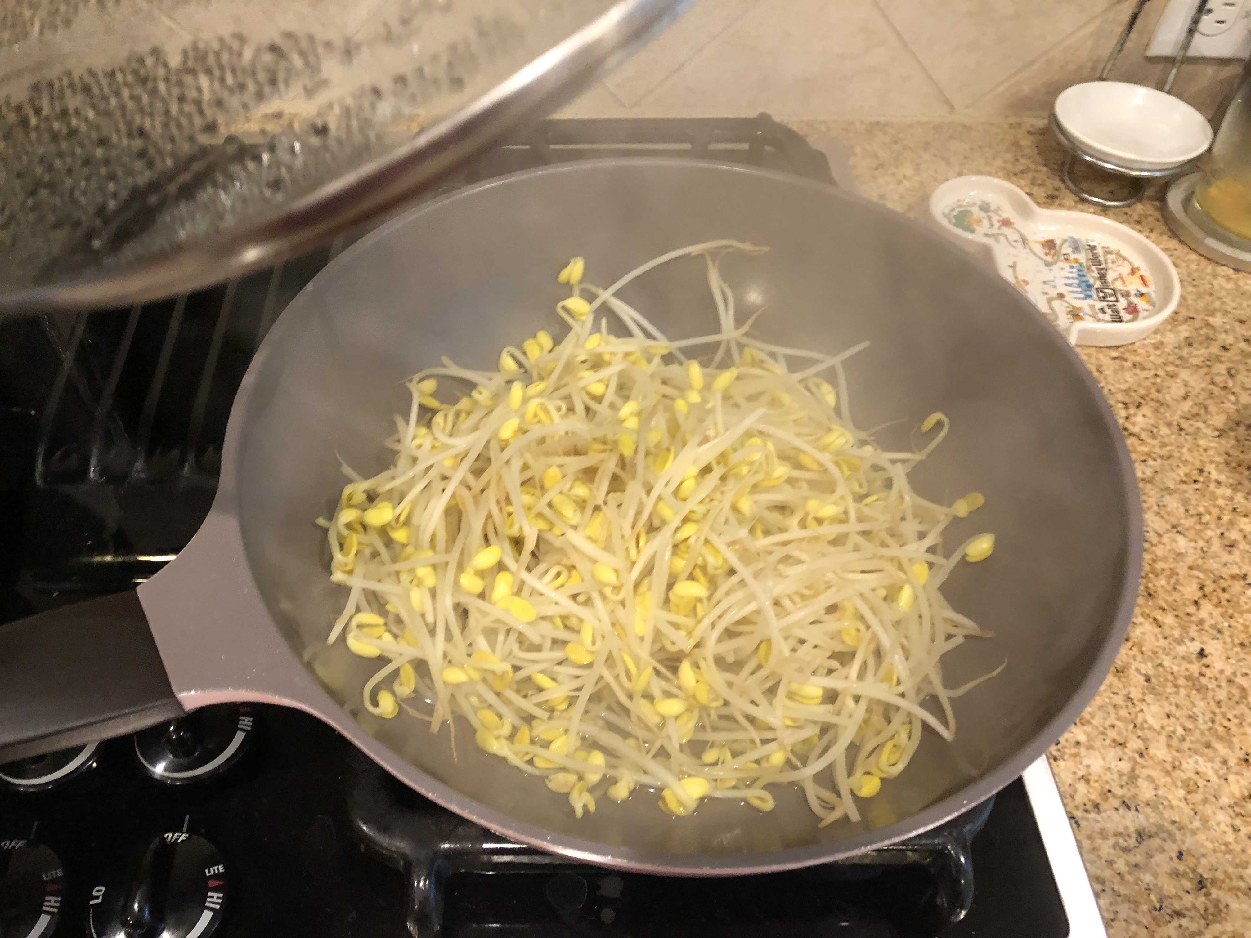 콩나물을 흐르는 물에 3~4번 씻어준다. 물 한 컵정도를 냄비에 넣고 강불로 팔팔 끓여준 다음 콩나물을 넣고 뚜껑을 덮은 다음 강불로 다시 3분간 익혀주고 불을 끈다. (또는 콩나물을 냄비에 넣고 물 50 ml를 넣은 다음 뚜껑을 덮고 중약불로 5분간 익혀주기도 한다.) 이렇게 삶은 콩나물은 아삭한 식감이 나도록 얼음을 넣은 찬 물에 담가 식혀준다. 차가워진 콩나물을 꺼내서 물기를 충분히 빼주도록 한다.