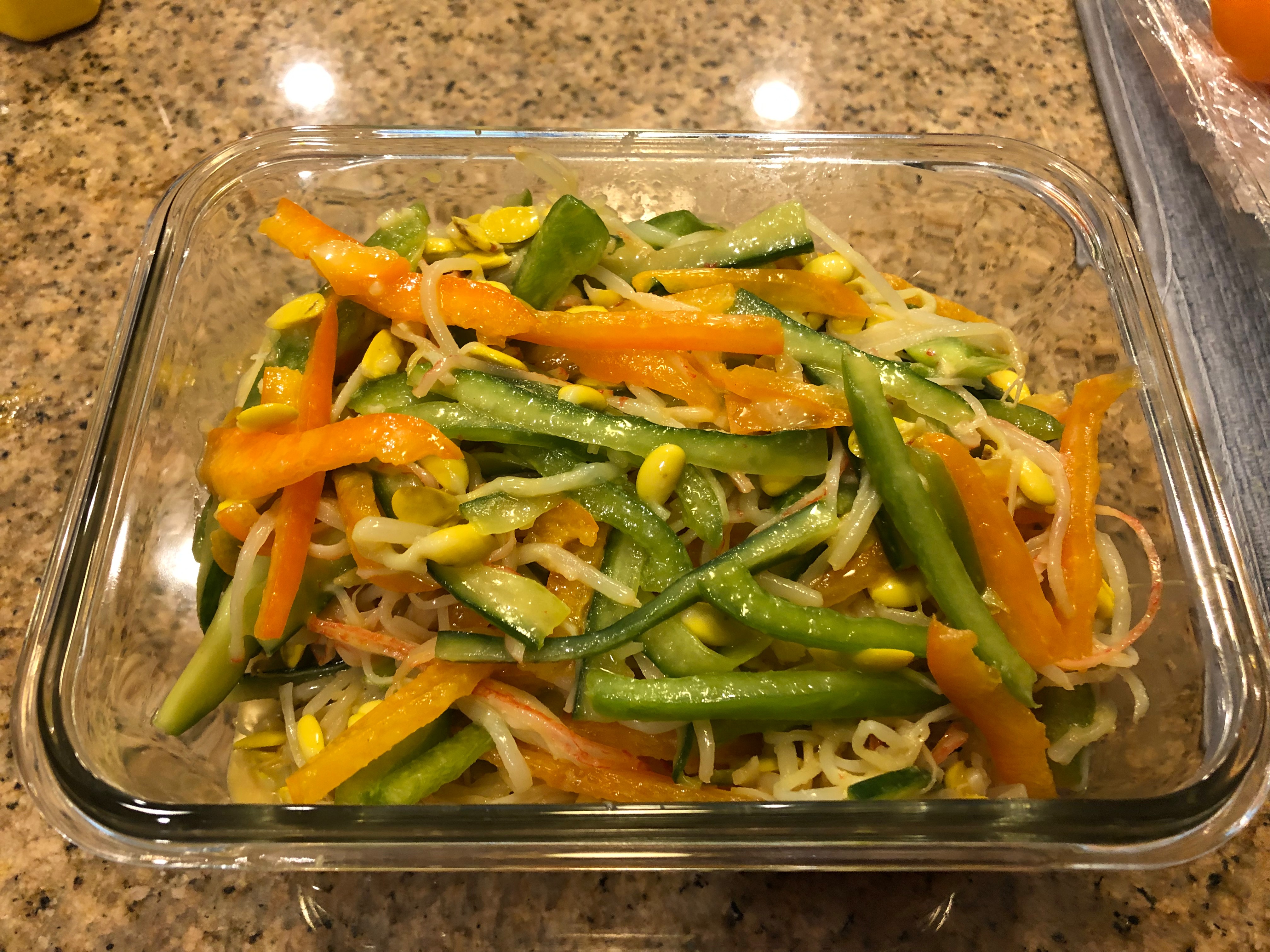 여름이 다 지나가는 9월초 미국 노동절 (Labor day) 주말, 간만에 처가집 식구들이 모여 핫도그 파티를 했다. 파티에 어떤 음식을 가져가볼까 하다가 얼마전 유튜버 "이 남자의 cook"이 소개한 겨자소스를 이용한 콩나물 냉채요리에 도전해보기로 했다. 집냉장고에 있던 콩나물, 야채, 게맛살을 이용해 약 1시간 30분 정도 시간을 투자해 뚝딱 만들어보았다.