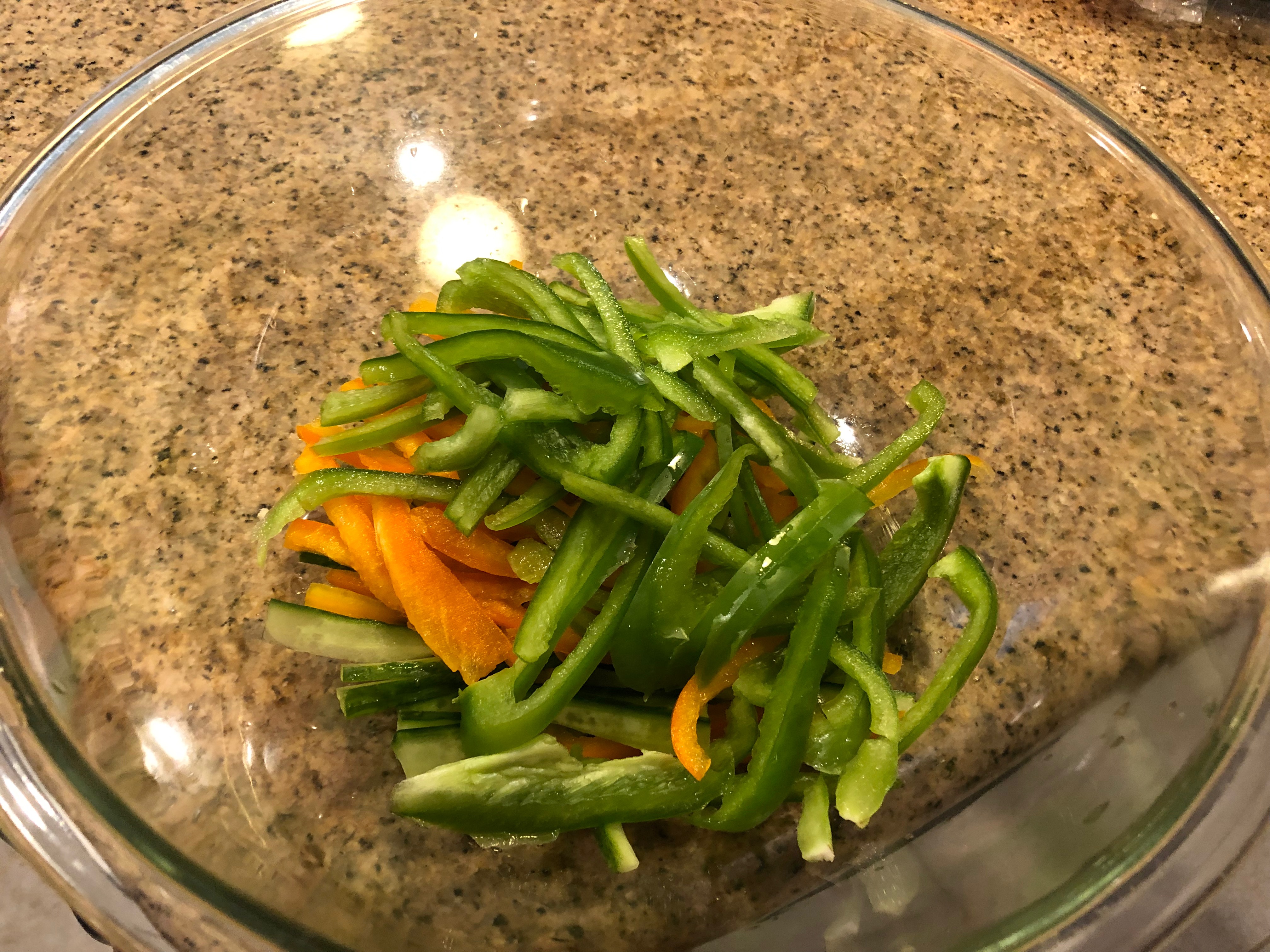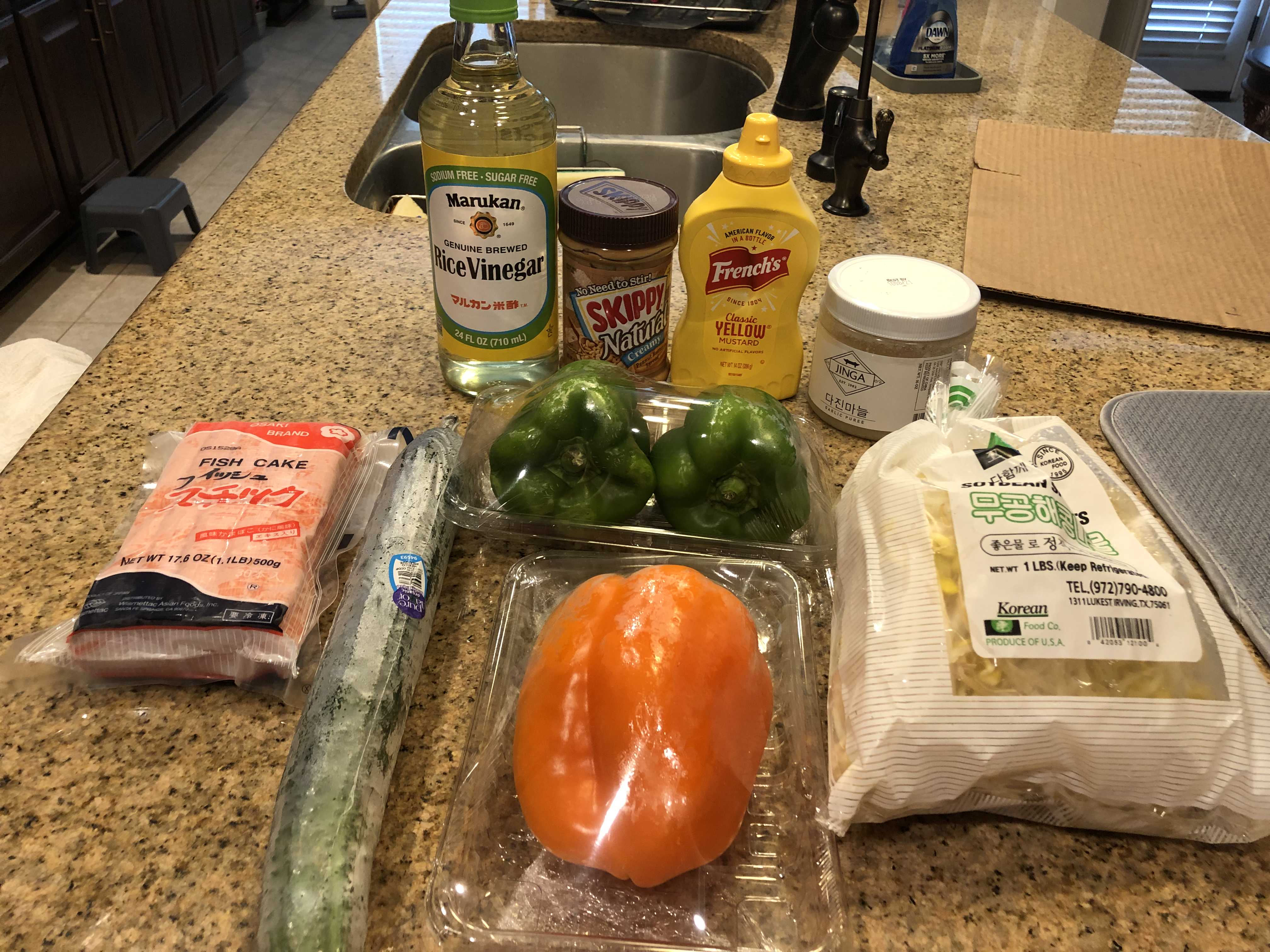 - 재료: 취향에 따라 콩나물 300 ~ 450g정도 (1 lbs), 오이 1개, 홍피망(Red Bell Pepper)1/2개, 청피망(Green Bell Pepper) 1/2개, 게맛살 250g 정도
