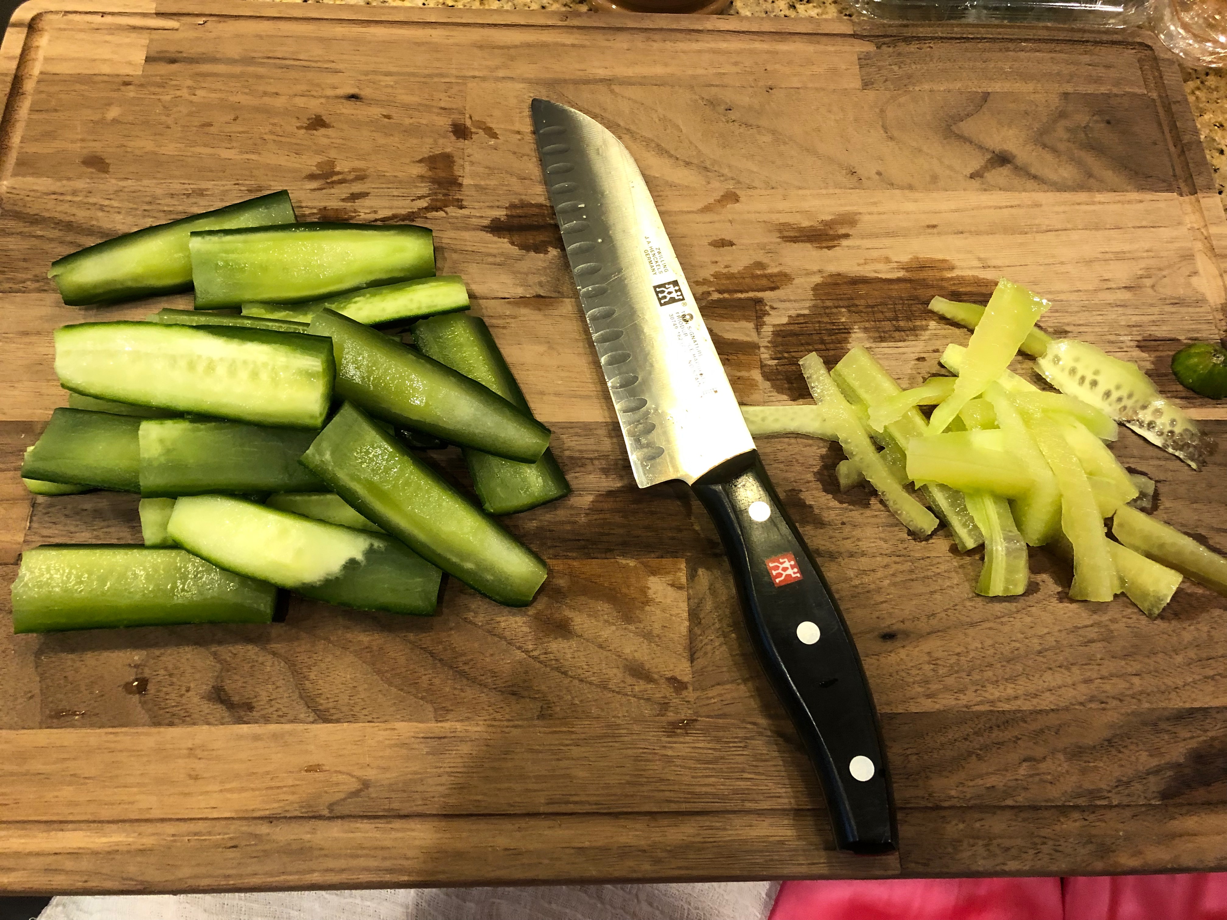 Step2: 오이를 3~4등분해서 오이씨를 제거해준 다음 채썰어준다.