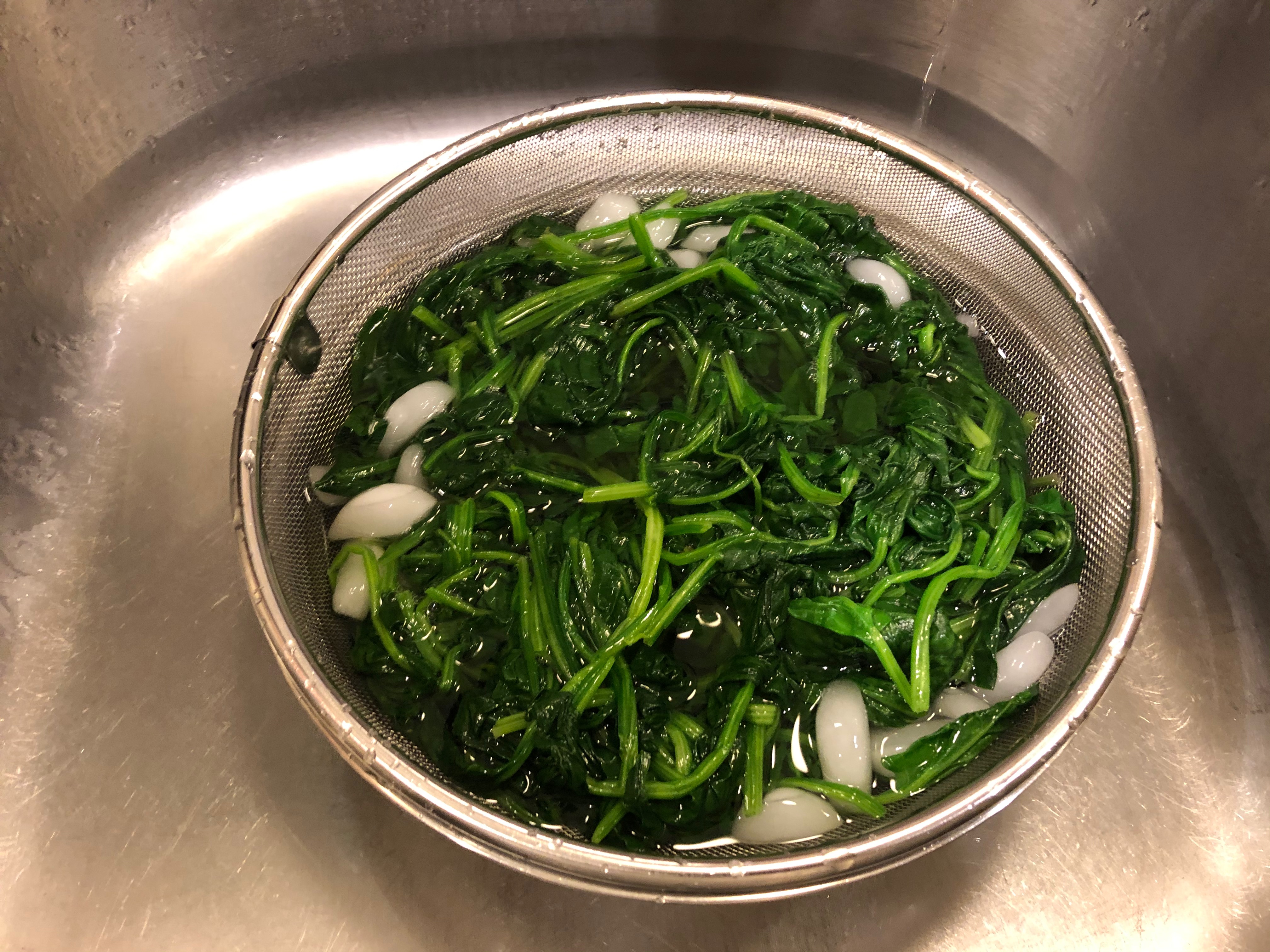 시금치를 데치고 난 후 꺼내서 체에 밭쳐주어 뜨거운 물기를 빼준다.