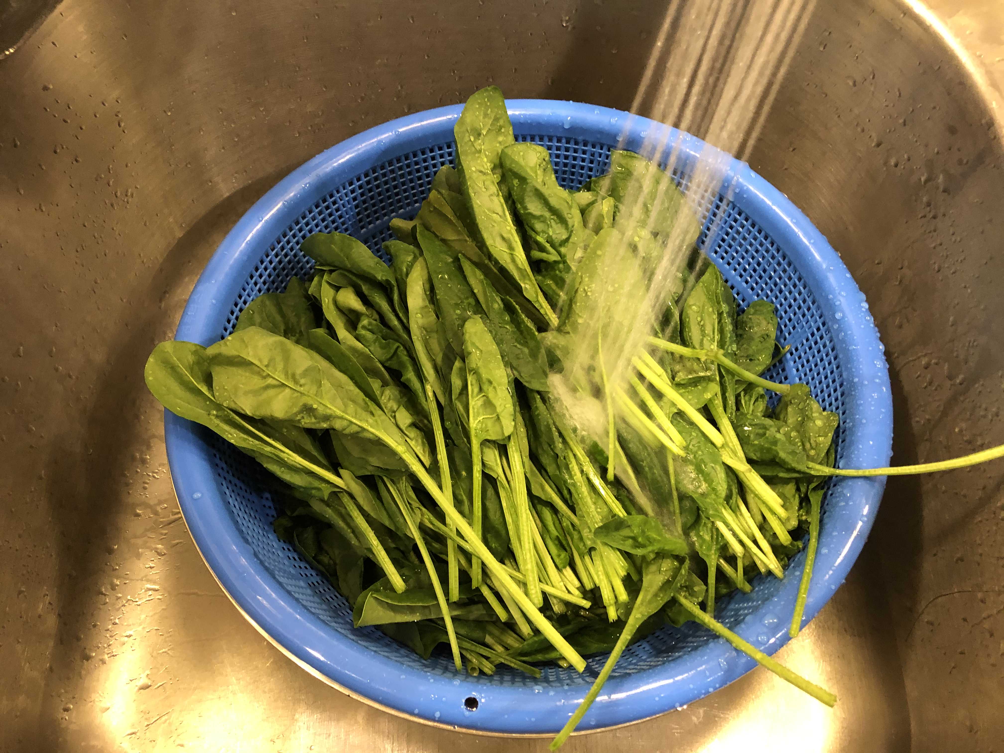 다듬은 시금치는 흐르는 물에 가볍게 씻어준다. 잎파리가 상하지 않도록 살살 가볍게 씻어 흙이나 이물질을 털어내 준다.