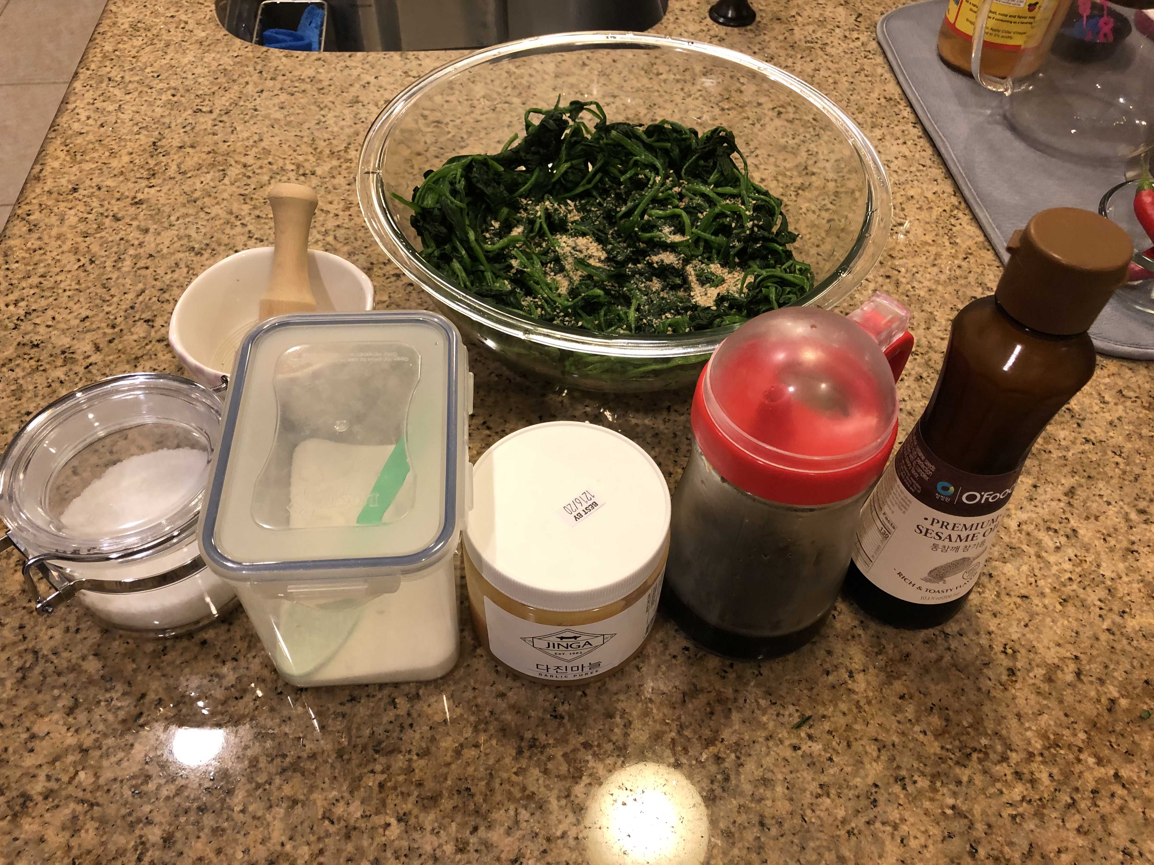 - 재료: 시금치 3단 (300g 정도), 간 마늘 1/2 큰술, 국간장 2큰술, 참기름 2큰술, 곱게 갈아준 깨 1 작은술