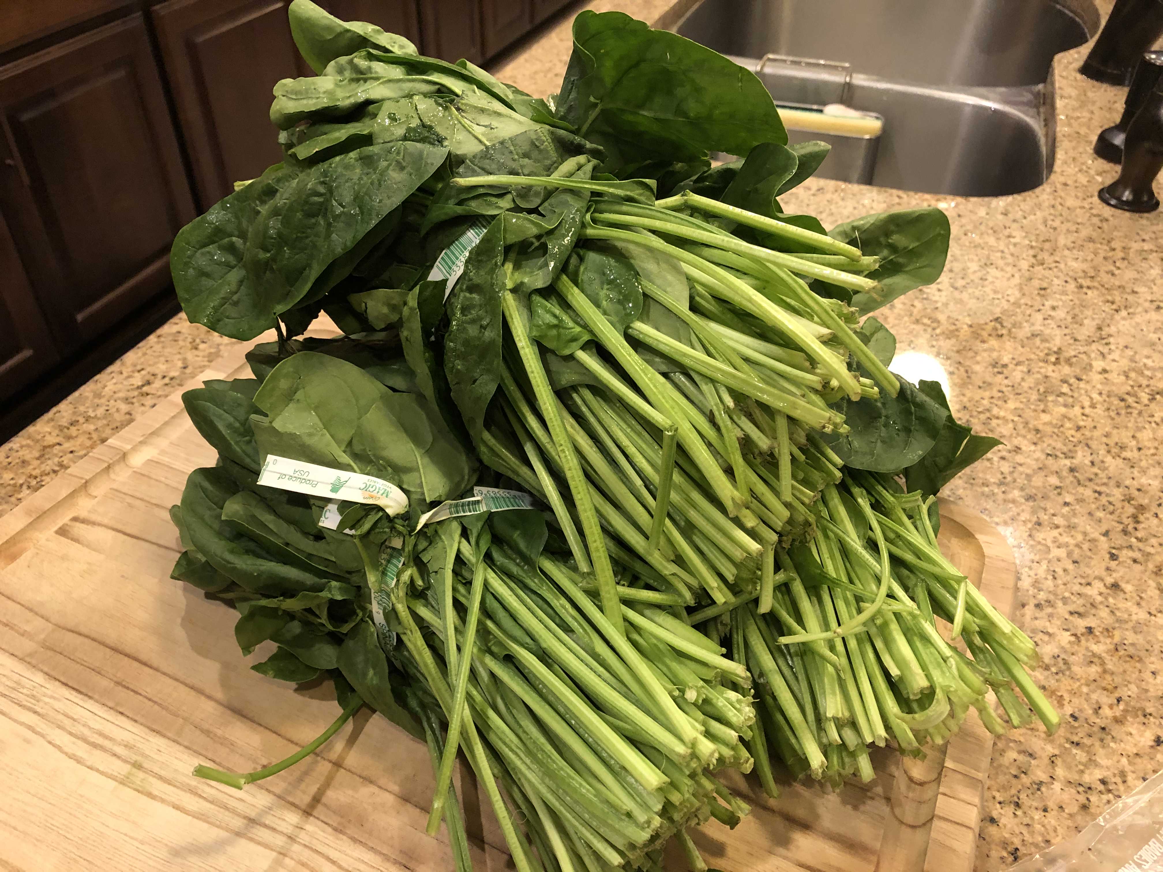 휴스턴에는 Kroger라는 식료품점 체인이 있다. 그 곳에서 비교적 신선해보이는 시금치를 발견하여 3단 정도 구입하였다. 시금치 3단이 많아 보이지만 일단 물에 삶고 나면 겨우 두세 주먹 정도의 양밖에 나오지 않는다. 일단 시금치 줄기의 끝부분을 칼로 잘라주어 더러운 부분을 제거했다. 보통 한국에서 사는 시금치 경우 뿌리채로 나와서 뿌리의 흙만 칼로 제거해주지만 미국에서 줄기 부분이 잘린 채로 나와서 줄기 끝 더러운 부분만 잘라내준다.