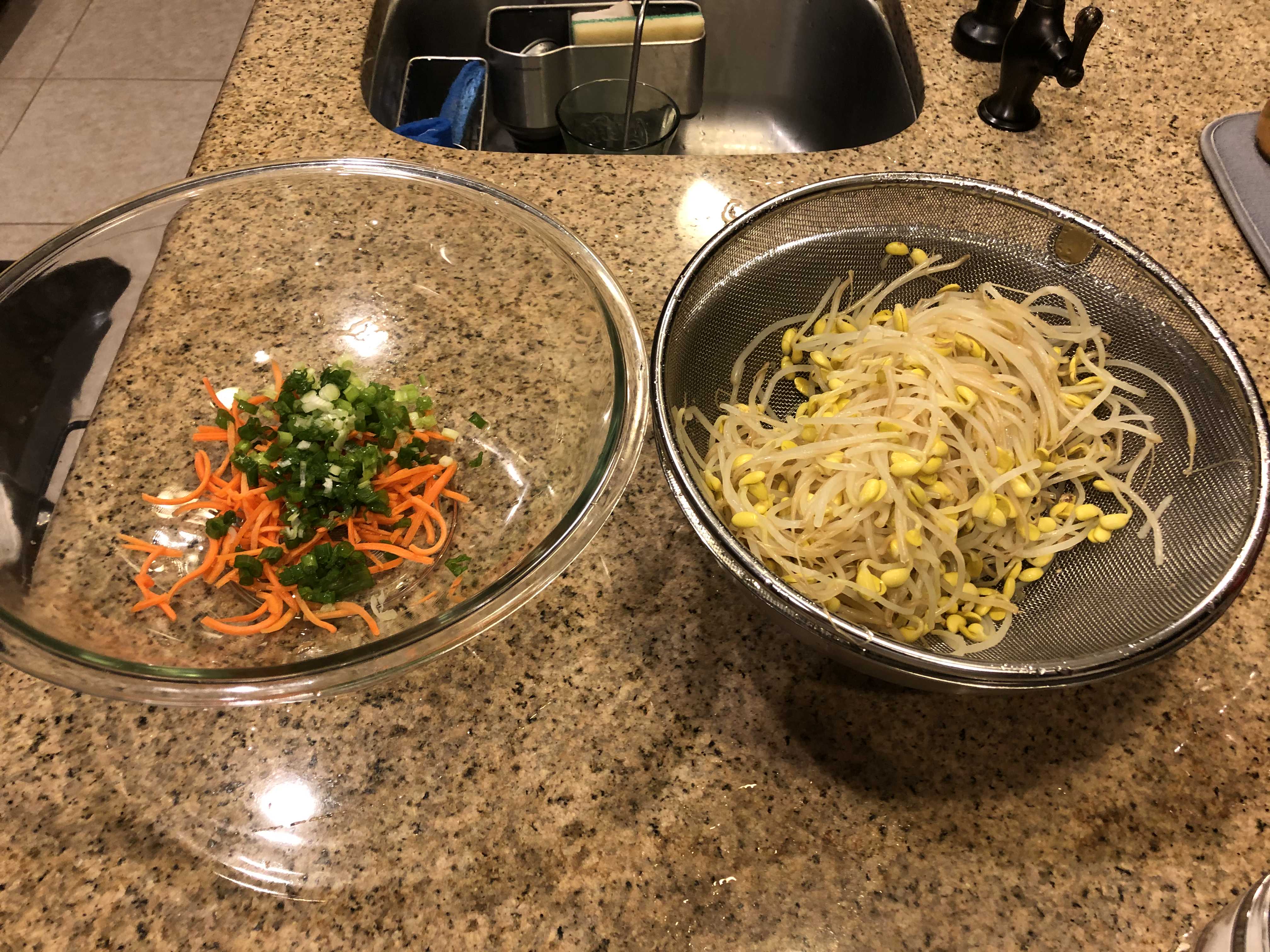 쪽파 2 ~ 3대를 잘게 썰어주고 채썬 당근을 적당량 준비한다. 얼음물에 담가놓았던 콩나물을 채반에 옮겨 물기를 충분히 빼준다. 물기를 충분히 빼주지 않으면 나중에 양념을 넣고 무칠 때 맛이 좀 싱거워질 수도 있으며 나중에 반찬통에 보관할 때 물기가 많이 나와 맛이 변할 때도 있다.