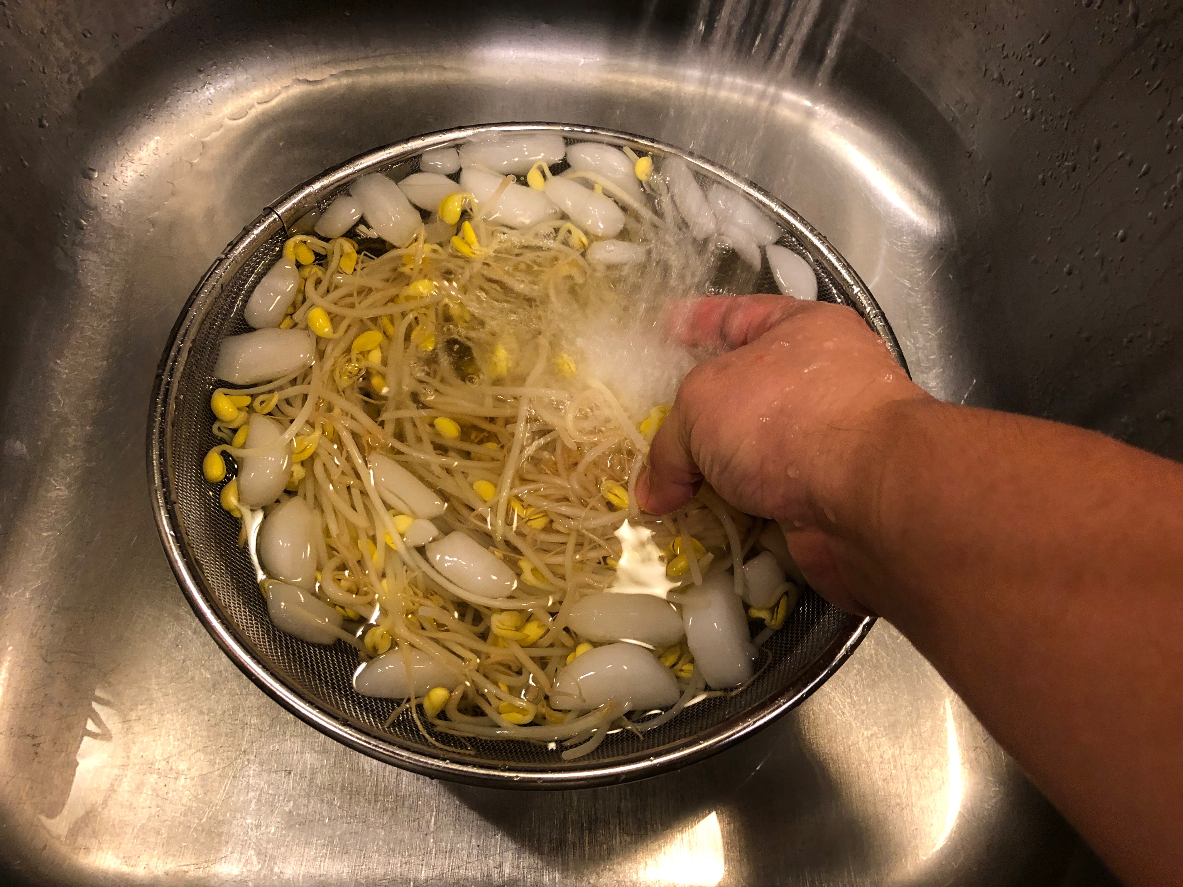 뜨겁게 삶아진 콩나물을 냄비에서 꺼내 채에 받쳐준 다음 얼음물을 넣고 재빨리 식혀준다. 이렇게 하면 콩나물의 아삭한 식감을 즐길 수 있다.
