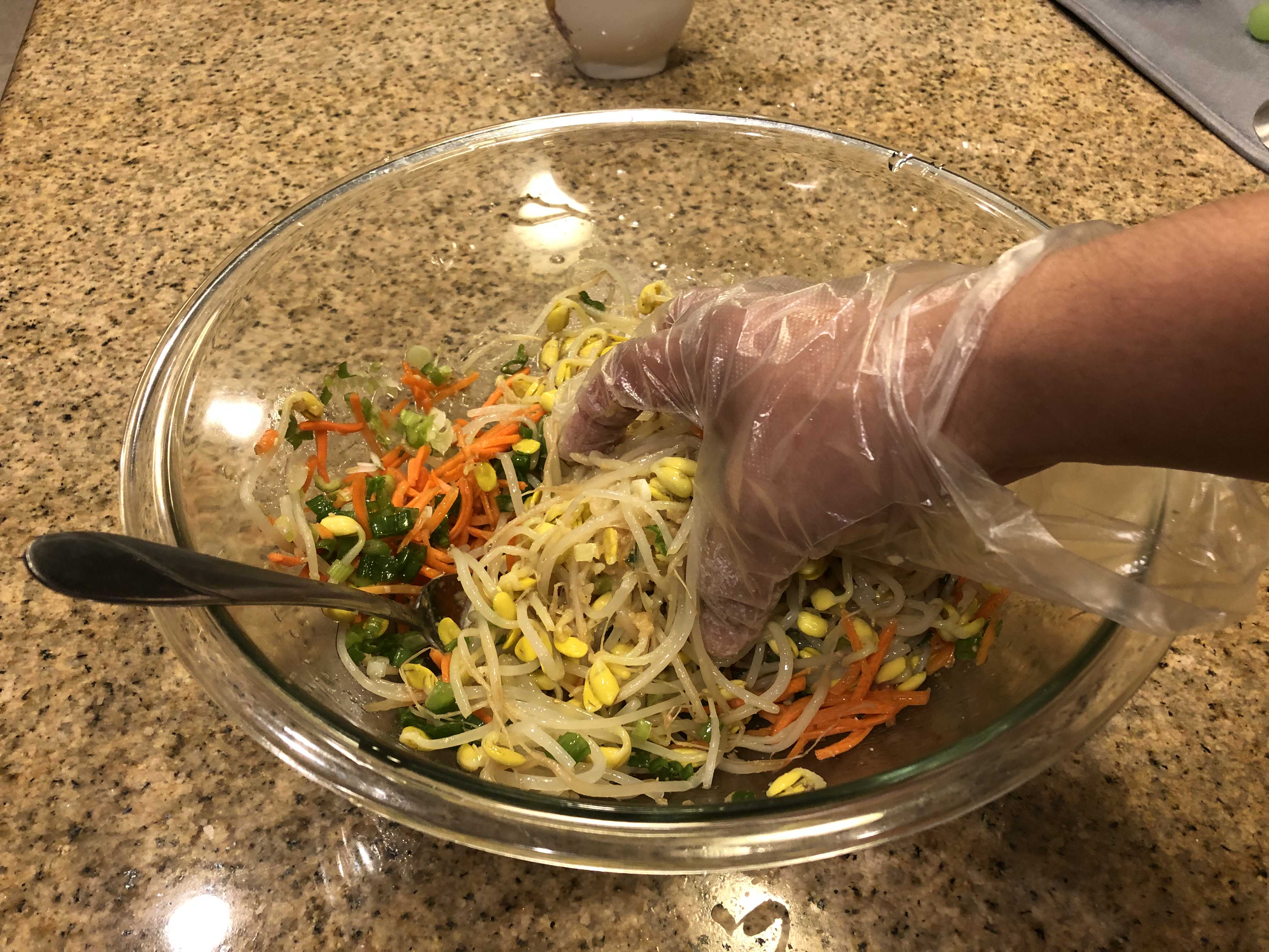 기호에 따라 꽃소금양을 반 큰 술에서 2/3큰술 정도 조정해주면서 양념이 콩나물에 잘 버무려지도록 무쳐준다. 설탕 반 스푼을 넣어주면 단 맛이 다른 양념 맛들과 어울어져 양념 맛이 배가된다.