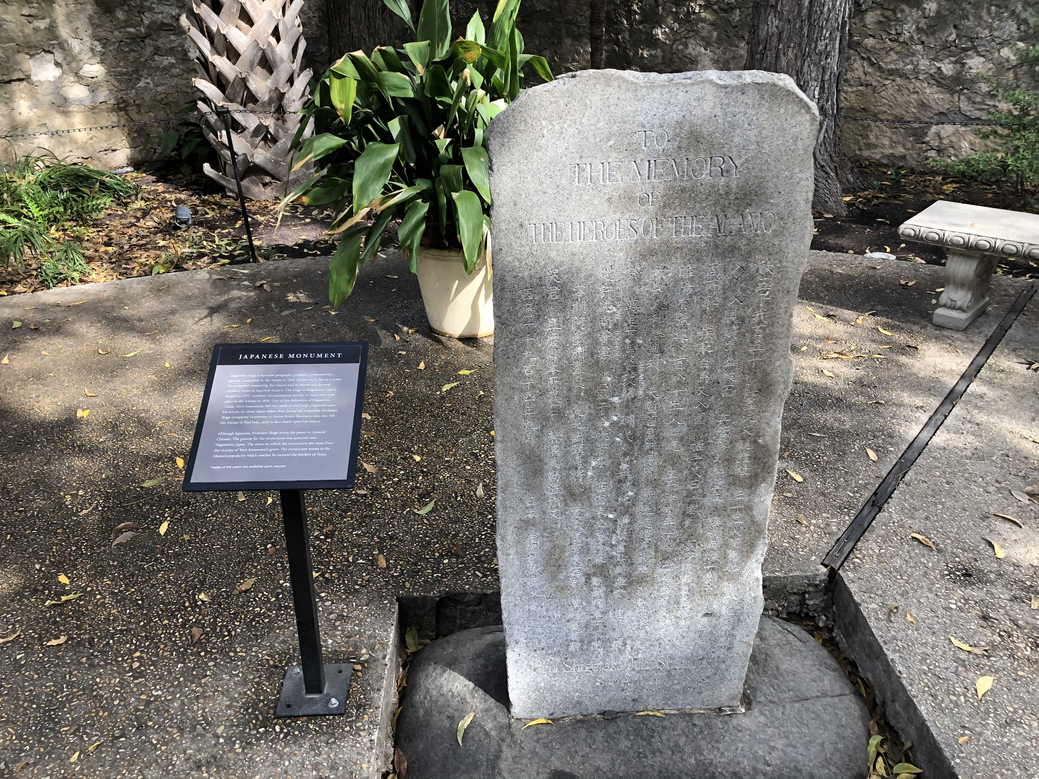 알라모 요새 한 구석에는 한문으로 쓰인 비석이 하나 있는데 그것은 1914년 일본인 지리학자 시게타가 시가 교수가 알라모 요새에 헌정한 비문이다. 이 비문에는 알라모 전투를 1575년 일본에 있었던 나가시노 성 전투와 비교하면서 지은 시가 새겨져 있다. 자세한 내용은 알라모 요새 전투 당시 지원군 요청을 담당했던 메신저가 본인이 죽을 줄 알면서도 다시 알라모로 돌아와 동료들과 함께 전사한 것이 나가시노 성 전투 당시 메신저가 했던 행위가 비슷하다 하여 이를 기념하기 위해 시를 지었다는 내용이다. 생각지도 못한 장소에 일본인의 자취가 있어서 조금 놀랐지만 당시 가쓰라 태프트 밀약을 체결한 직후 일본과 미국의 우호관계를 생각하면 일본인 학자가 했던 그 오버액션이 조금 이해될 만했다.