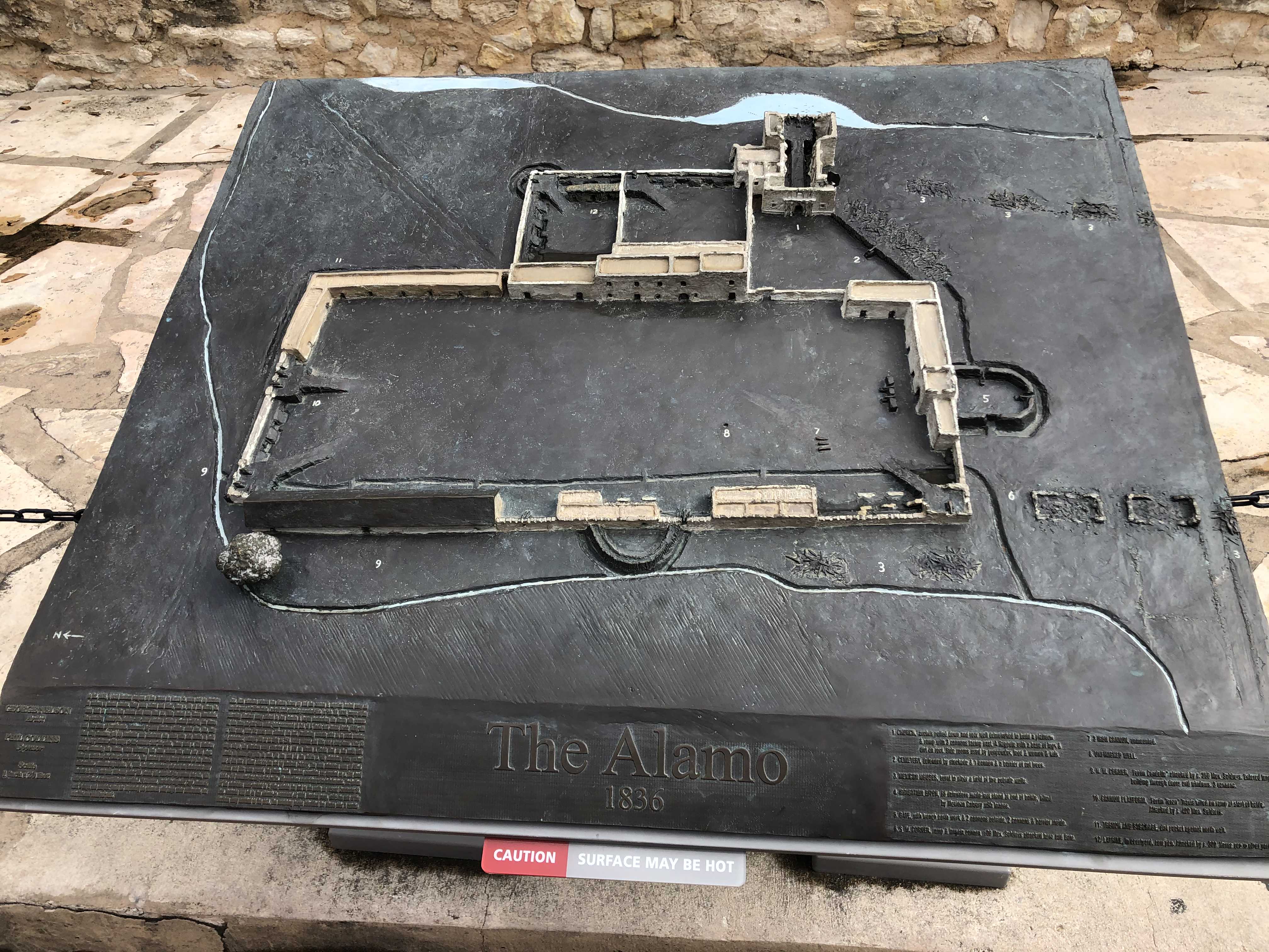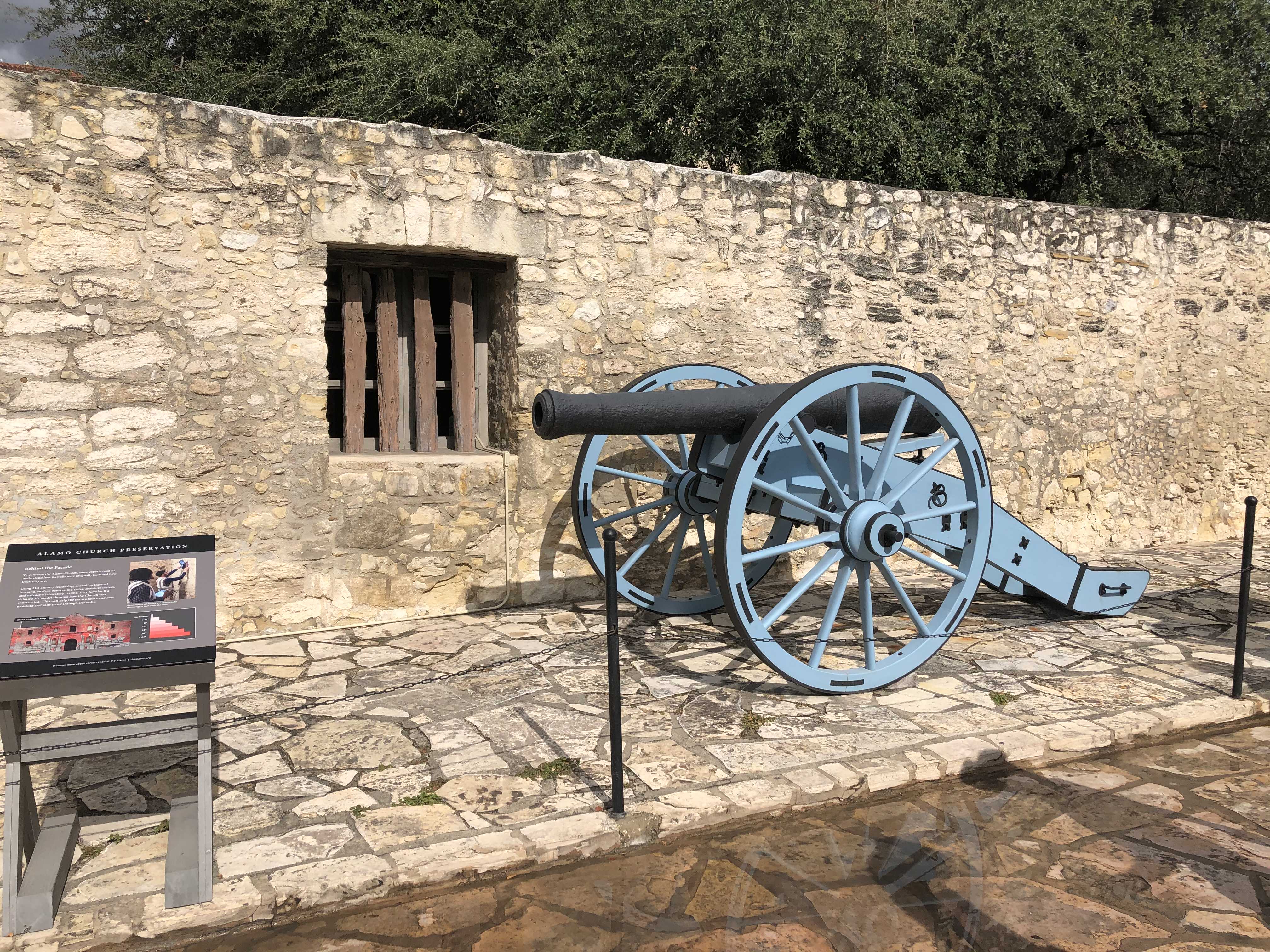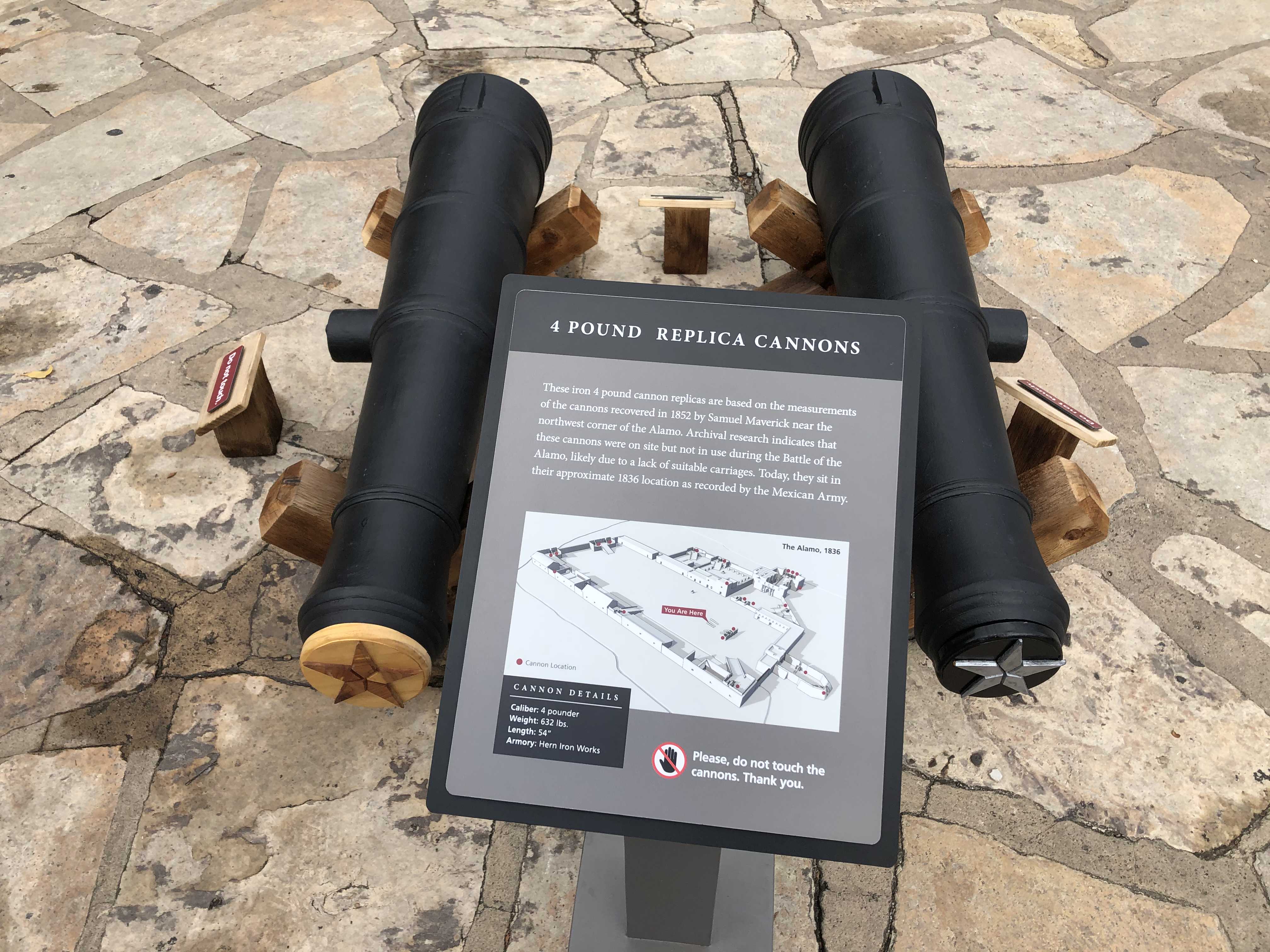 알라모 기념관 부근에 알라모 요새에서 발견된 4 파운더 (pounder)라는 포신 모형이 전시되어있었다. 이 포는 1852년에 알라모 요새 건물터에서 발견되었는데 실제 전투에서는 운반상의 불편함으로 인해 사용되지 않았다고 전해진다.