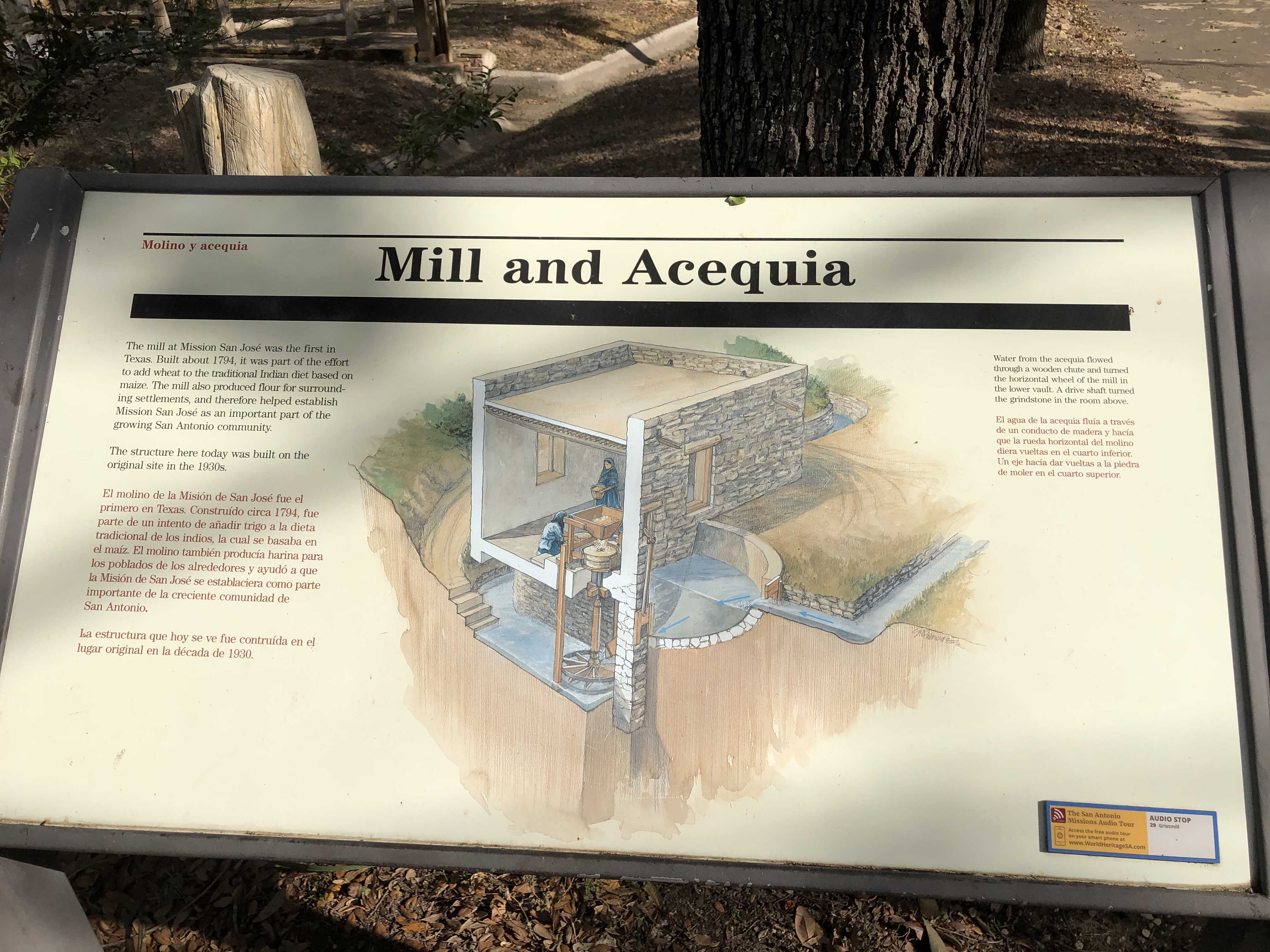 교회 건물에서 멀지 않은 곳 돌담 벼락에 출입문이 있다. 그곳을 지나면 당시 관개수로를 이용해 밀가루를 만들던 방앗간이 있다 (Mill and Acequia). 이 곳은 당시 교화된 인디언 원주민들의 주식을 밀가루로 된 빵으로 바꾸게 하기 위해 만들어진 장소이다. 텍사스 지역에서 처음으로 만들어진 방앗간으로 1794년 처음 지어졌으며 1930년대 복원되었다고 한다.