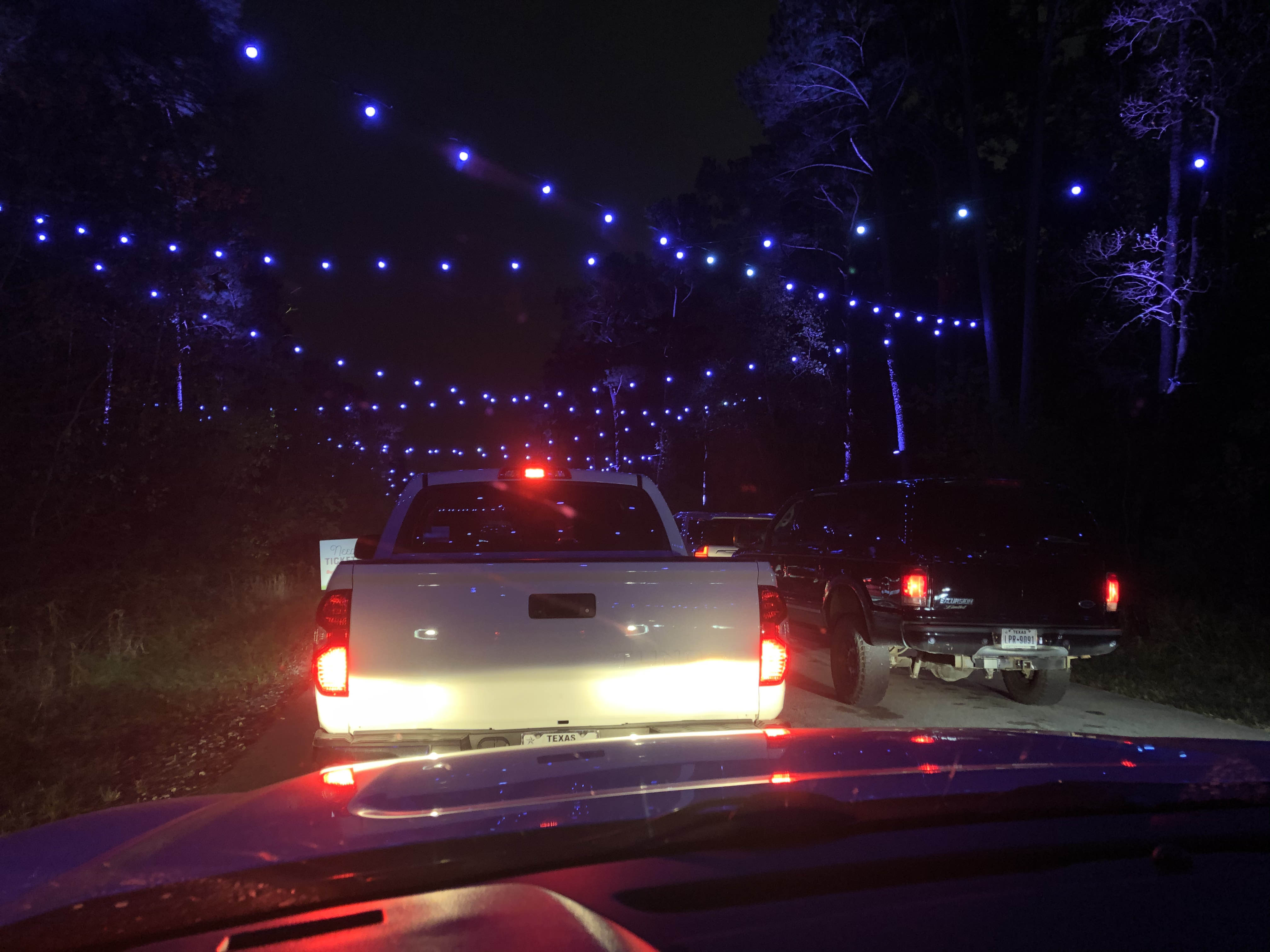 라이트 파크 쇼 입장시 자동차 헤드라이트를 꺼야 한다는 설명을 듣고 앞 차를 따라 느릿느릿한 속도로 파크에 입장한다.
