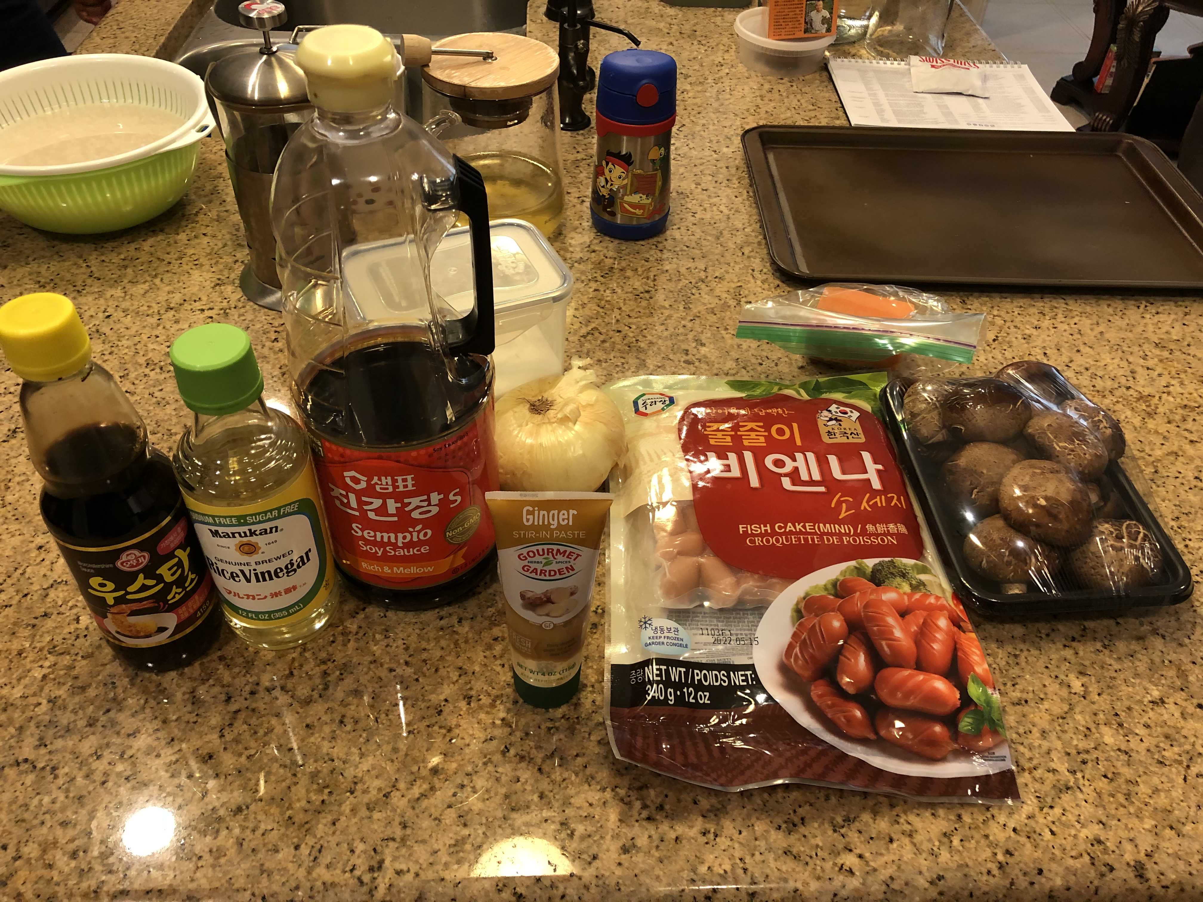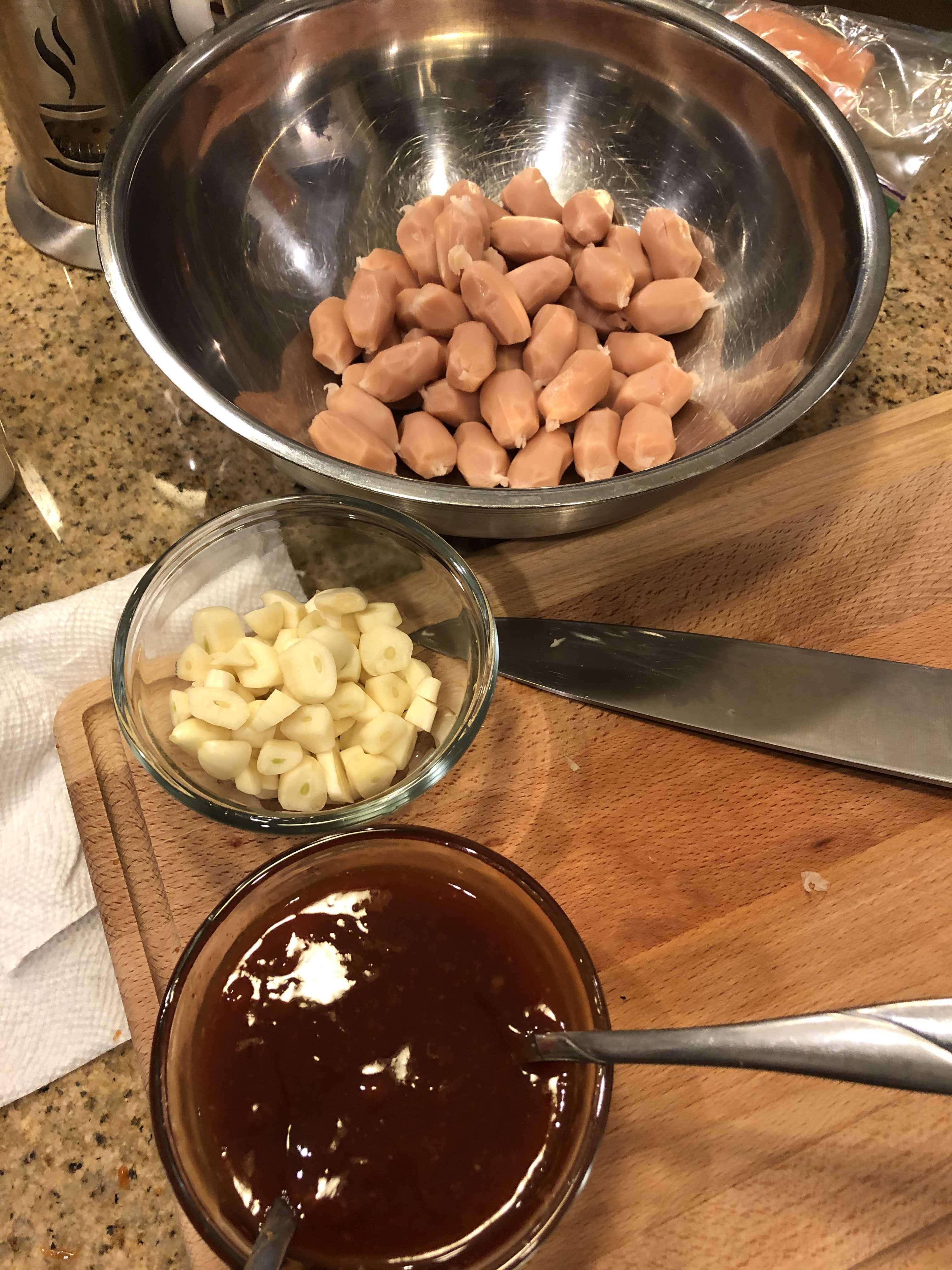- 재료: 비엔나 소시지 한 봉지 (300g), 식용유 3큰술, 마늘 10개 (40g), 양파 1/2개 (80g), 양송이 2개(50g), 파프리카 1/4개(80g), 당근 1/5개(20g), 깨소금 적당량, 후춧가루 적당량, 양송이 버섯과 파프리카는 옵션이다. 양송이버섯 대신에 표고버섯을 써도 무방하다.