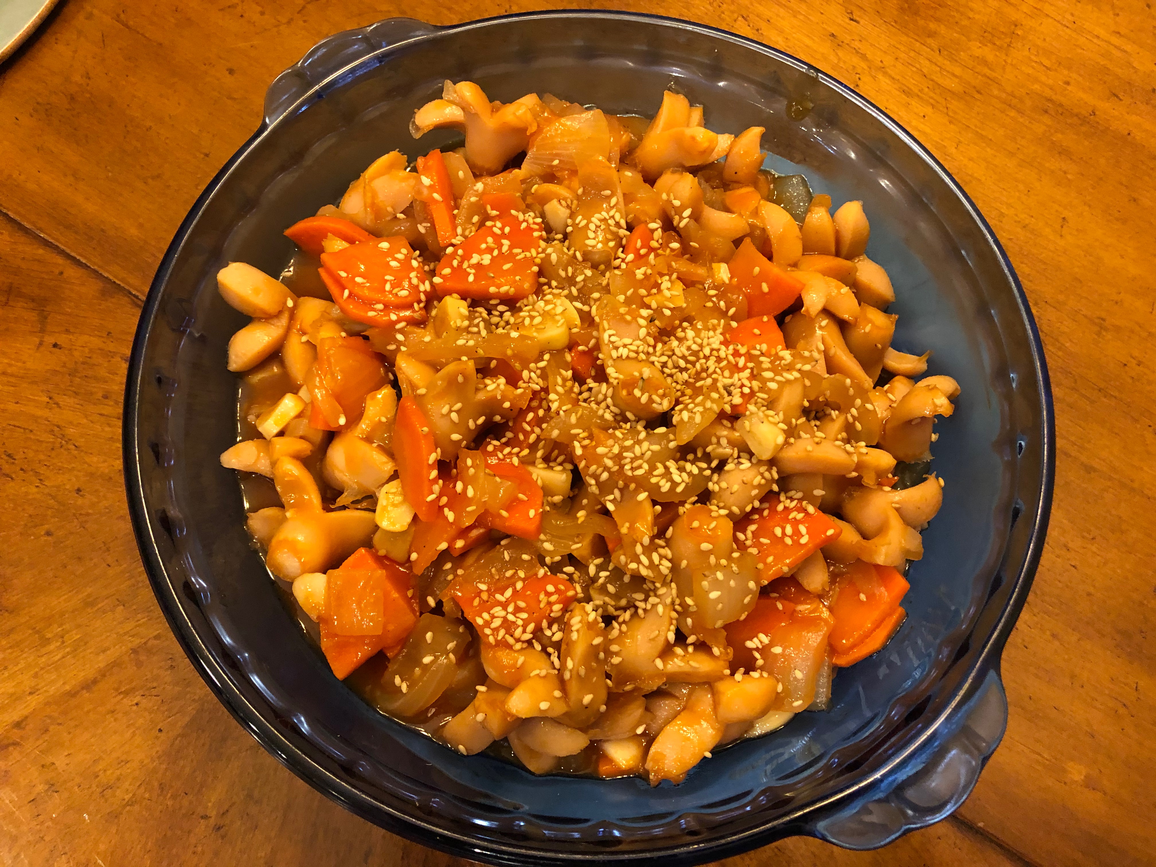 야채 중 하나를 샘플로 꺼내서 잘 익었는지, 양념이 잘 버무려졌는지 맛을 본다. 당근을 넣었다면 당근을 한 조각을 꺼내서 맛을 보는 것이 좋다. 당근이 익었다면 다른 재료들은 충분히 익은 것으로 생각해도 좋다. 접시에 담고 깨소금을 약간 뿌려준 다음 식탁에 내어놓는다.