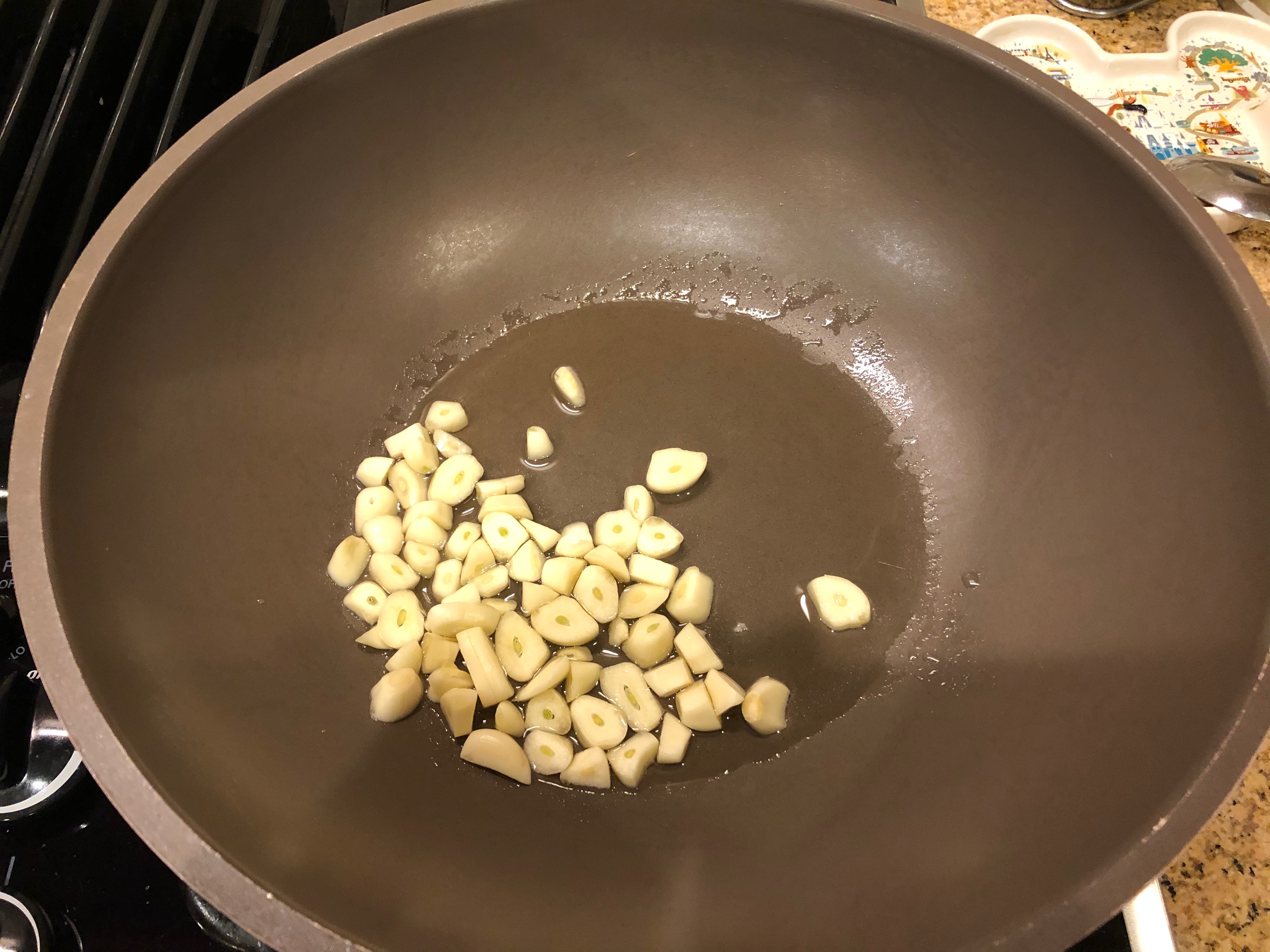 프라이팬에 식용유 3큰술을 둘러주고 썰어둔 마늘 10개를 넣어 중불에 익혀준다. 마늘은 기름에 튀기듯이 익혀주어 기름에 마늘향이 충분히 배어나게 한다.