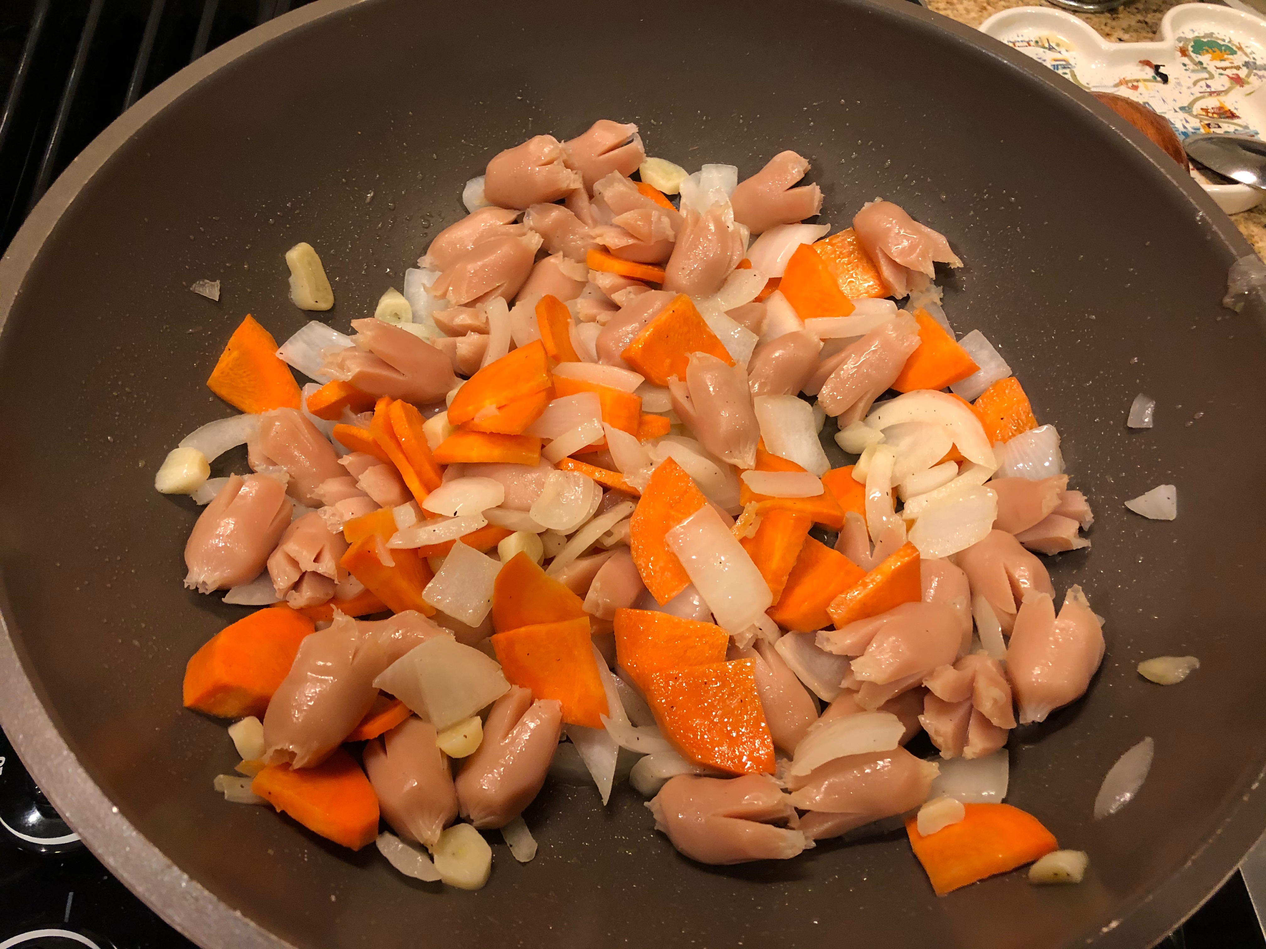 소시지를 넣고 기름이 소시지에 잘 둘러지게 한 후 바로 손질해 두었던 야채(당근 또는 버섯)를 넣고 같이 볶아준다. 나는 당근을 큼지막하게 썰어서 그런지 익는 시간이 더 걸려서 오랫동안 볶아야 했다.