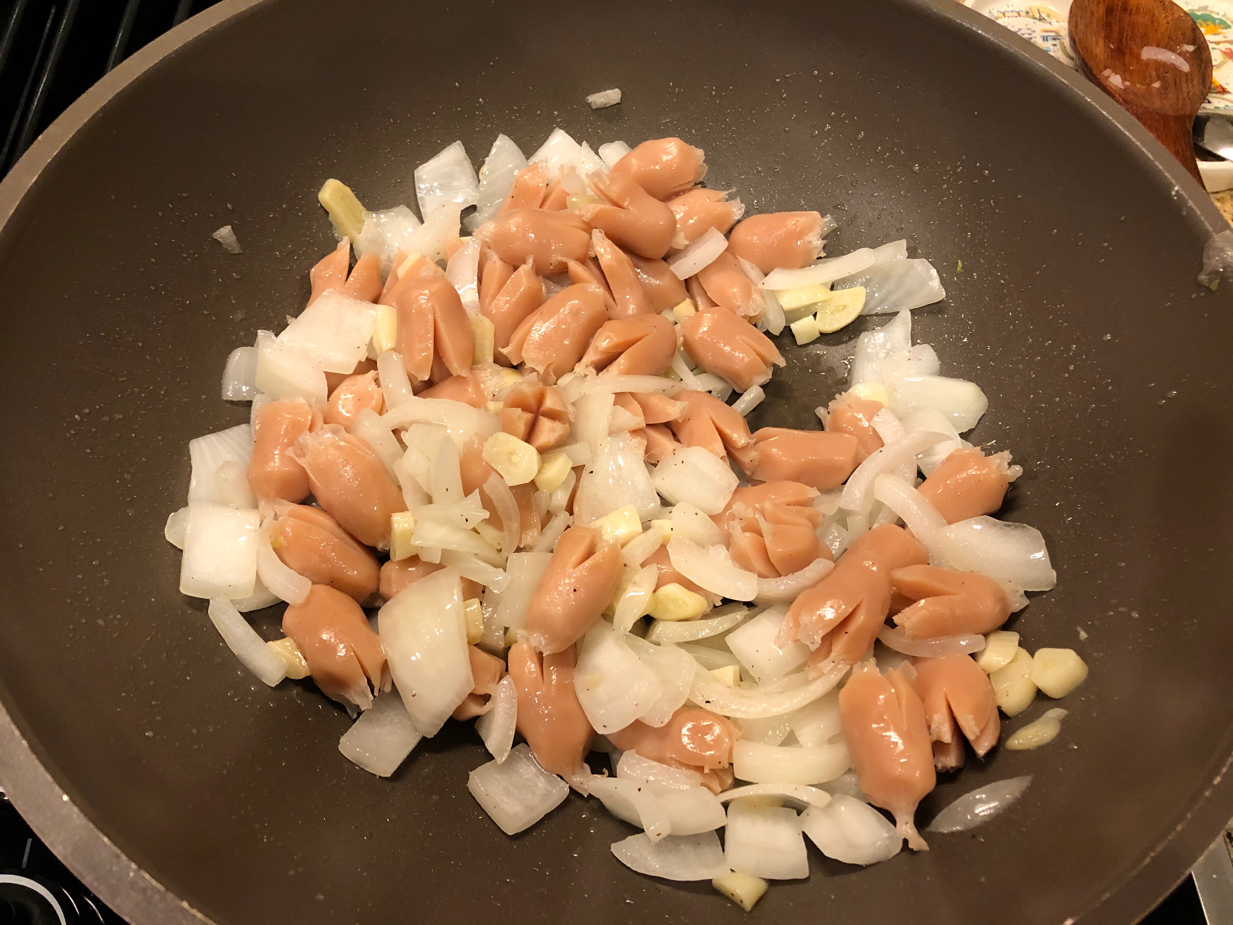 양파가 투명한 빛깔을 보이기 시작하면서 어느 정도 볶아지면 소시지를 넣어서 소시지가 쭈꾸미의 모양을 가질때까지 볶아준다. 불은 계속 중불로 가져간다.