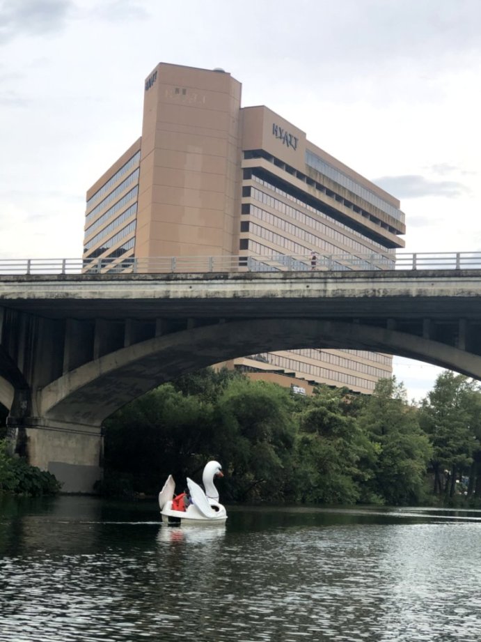 다음날 아침, 호텔룸에서 간단한 아침식사를 하고 바로 앞에 있는 보트대여소에 가서 swan boat를 타고 강가를 구경했다. 페달을 밟으면서 앞으로 나아가는 백조 모양의 보트인데 딸아이가 전날 박쥐쇼를 기다리던 중 사람들이 타는 것을 보고 본인도 타고 싶다하여 $15를 주고 1시간 동안 대여를 했다. 물론 30분도 안되어서 피곤하다며 그만 타자고 하는 것을 간신히 달래 1시간을 채웠지만 말이다. 아래 사진에 가족이 머물렀던 Hyatt Regency Austin이 보인다. 다리 밑을 지나면 혹시나 숙면중인 박쥐들을 볼 수 있을까 했지만 잘 보이지 않았다.